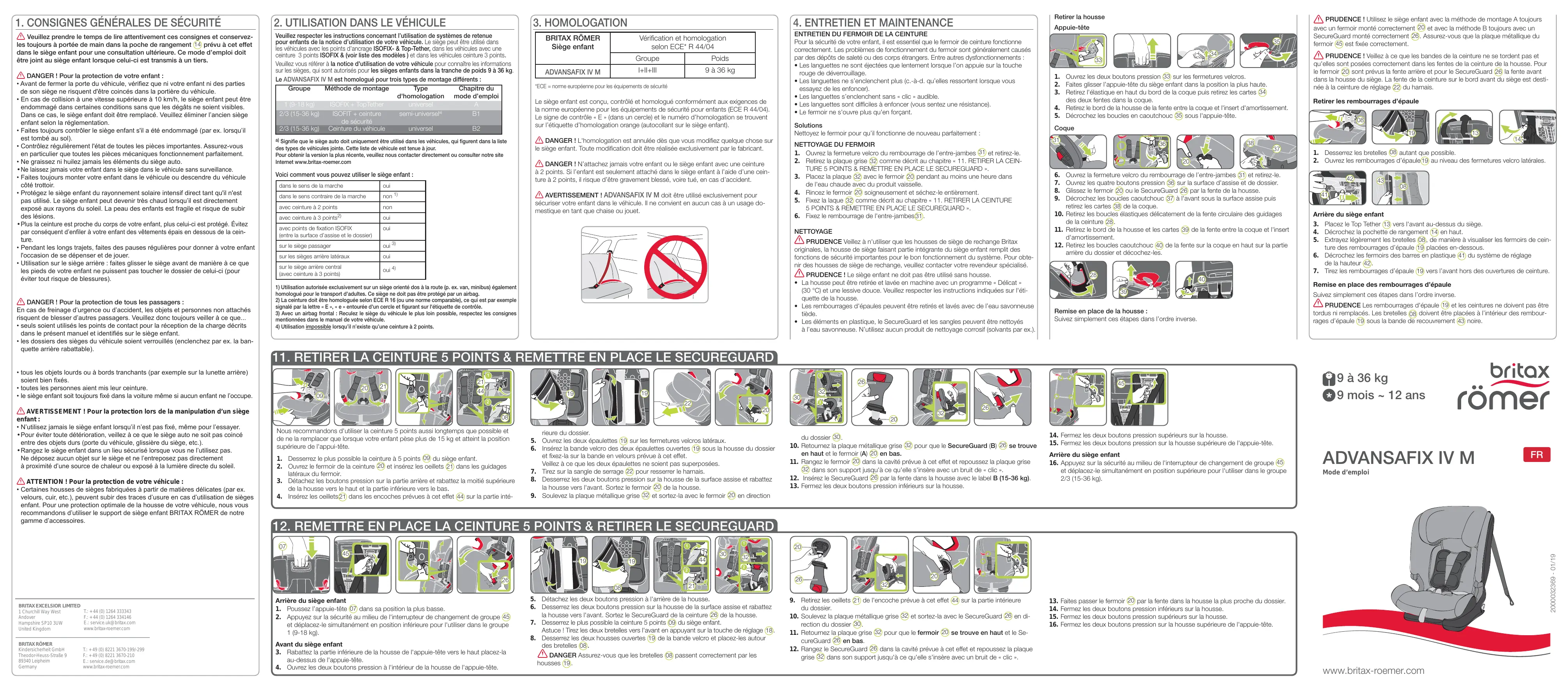 Le siège enfant est conçu, contrôlé et homologué conformément aux exigences de la norme européenne pour les équipements de sécurité pour enfants (ECE R 44/04). Le signe de contrôle « E » (dans un cercle) et le numéro d’homologation se trouvent sur l’étiquette d’homologation orange (autocollant sur le siège enfant). DANGER ! L'homologation est annulée dès que vous modifiez quelque chose sur le siège enfant. Toute modification doit être réalisée exclusivement par le fabricant. DANGER ! N’attachez jamais votre enfant ou le siège enfant avec une ceinture à 2 points. Si l’enfant est seulement attaché dans le siège enfant à l’aide d’une ceinture à 2 points, il risque d’être gravement blessé, voire tué, en cas d’accident. AVERTISSEMENT ! ADVANSAFIX IV M doit être utilisé exclusivement pour sécuriser votre enfant dans le véhicule. Il ne convient en aucun cas à un usage domestique en tant que chaise ou jouet.