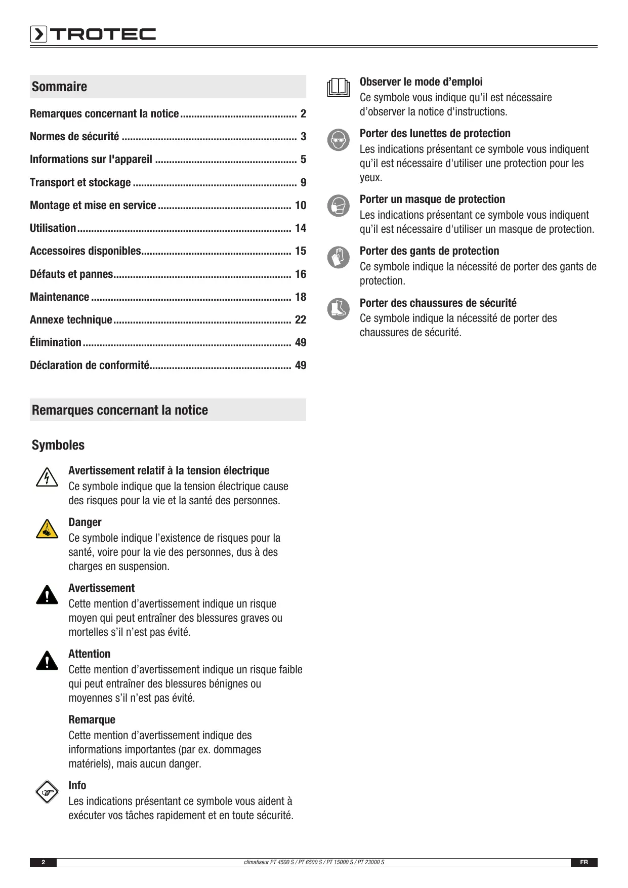 Remarques concernant la notice 2 Normes de sécurité 3 Informations sur l'appareil 5 Transport et stockage 9 Montage et mise en service 10 Utilisation 14 Accessoires disponibles 15 Défauts et pannes 16 Maintenance 18 Annexe technique 22 Élimination 49 Déclaration de conformité 49