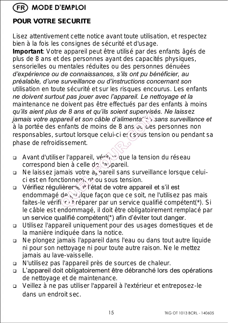 Lisez attentivement cette notice avant toute utilisation, et respectez bien à la fois les consignes de sécurité et d'usage. Important: Votre appareil peut être utilisé par des enfants âgés de plus de 8 ans et des personnes ayant des capacités physiques, sensorielles ou mentales réduites ou des personnes dénuées d’expérience ou de connaissances, s’ils ont pu bénéficier, au préalable, d’une surveillance ou d’instructions concernant son utilisation en toute sécurité et sur les risques encourus. Les enfants ne doivent surtout pas jouer avec l’appareil. Le nettoyage et la maintenance ne doivent pas être effectués par des enfants à moins qu’ils aient plus de 8 ans et qu’ils soient supervisés. Ne laiss ez jamais votre appareil et son câble d’alimentation sans surveillance et à la portée des enfants de moins de 8 ans ou des personnes non responsables, surtout lorsque celui-ci est sous tension ou pendant sa phase de refroidissement. Avant d'utiliser l'appareil, vérifiez que la tension du réseau correspond bien à celle de l'appareil. Ne laissez jamais votre appareil sans surveillance lorsque celuici est en fonctionnement ou sous tension. Vérifiez régulièrement l’état de votre appareil et s’il est endommagé de quelque façon que ce soit, ne l'utilisez pas mais faites-le vérifier et réparer par un service qualifié compétent(*). Si le câble est endommagé, il doit être obligatoirement remplacé par un service qualifié compétent(*) afin d’éviter tout danger. Utilisez l'appareil uniquement pour des usages domestiques et de la manière indiquée dans la notice. Ne plongez jamais l'appareil dans l'eau ou dans tout autre liquide ni pour son nettoyage ni pour toute autre raison. Ne le mettez jamais au lave-vaisselle. N'utilisez pas l'appareil près de sources de chaleur. L’appareil doit obligatoirement être débranché lors des opérations de nettoyage et de maintenance. Veillez à ne pas utiliser l'appareil à l'extérieur et entreposez-le dans un endroit sec.