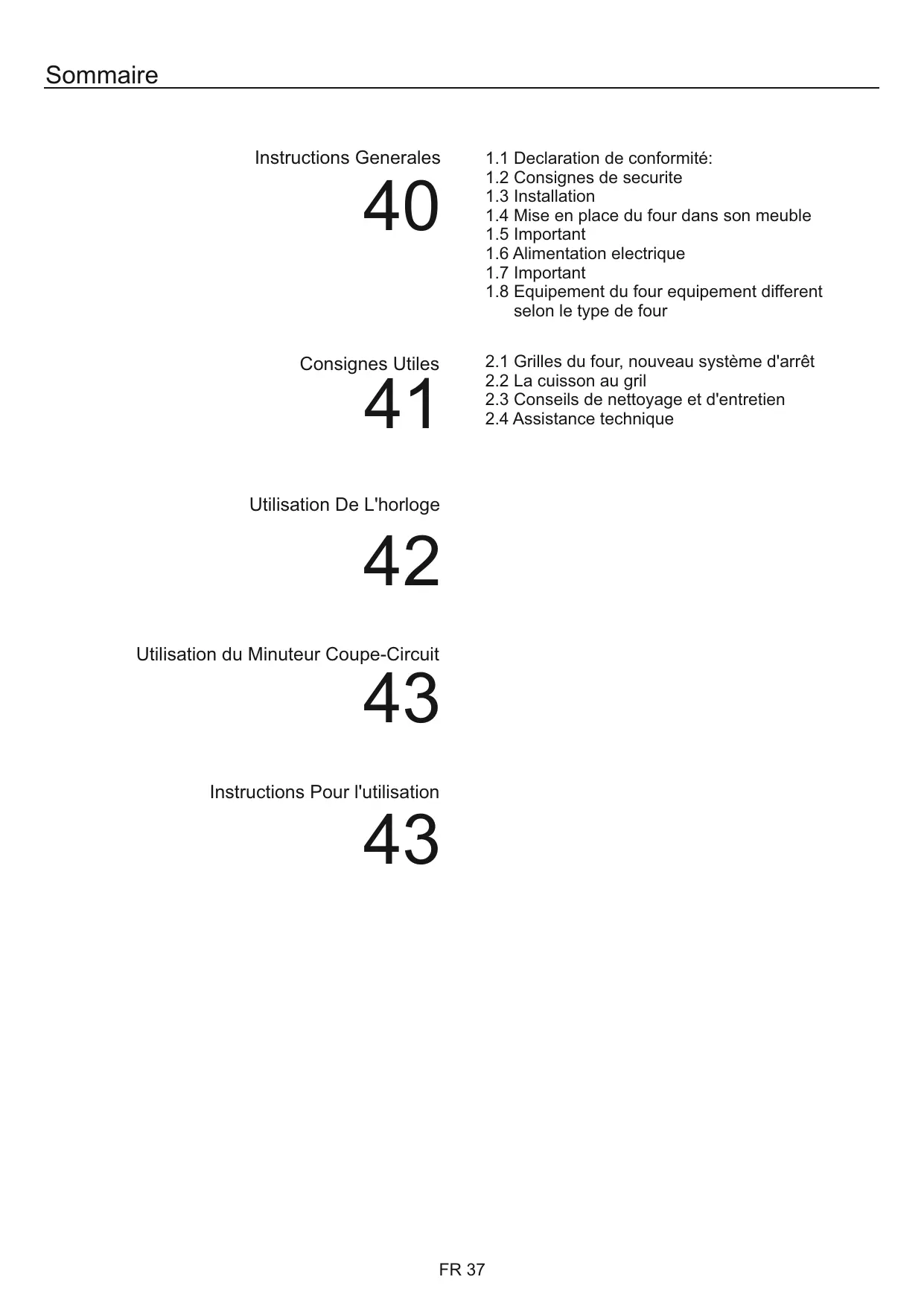 1.1 Declaration de conformité: 1.2 Consignes de securite 1.3 Installation 1.4 Mise en place du four dans son meuble 1.5 Important 1.6 Alimentation electrique 1.7 Important 1.8 Equipement du four equipement different selon le type de four 2.1 Grilles du four, nouveau système d'arrêt 2.2 La cuisson au gril 2.3 Conseils de nettoyage et d'entretien 2.4 Assistance technique