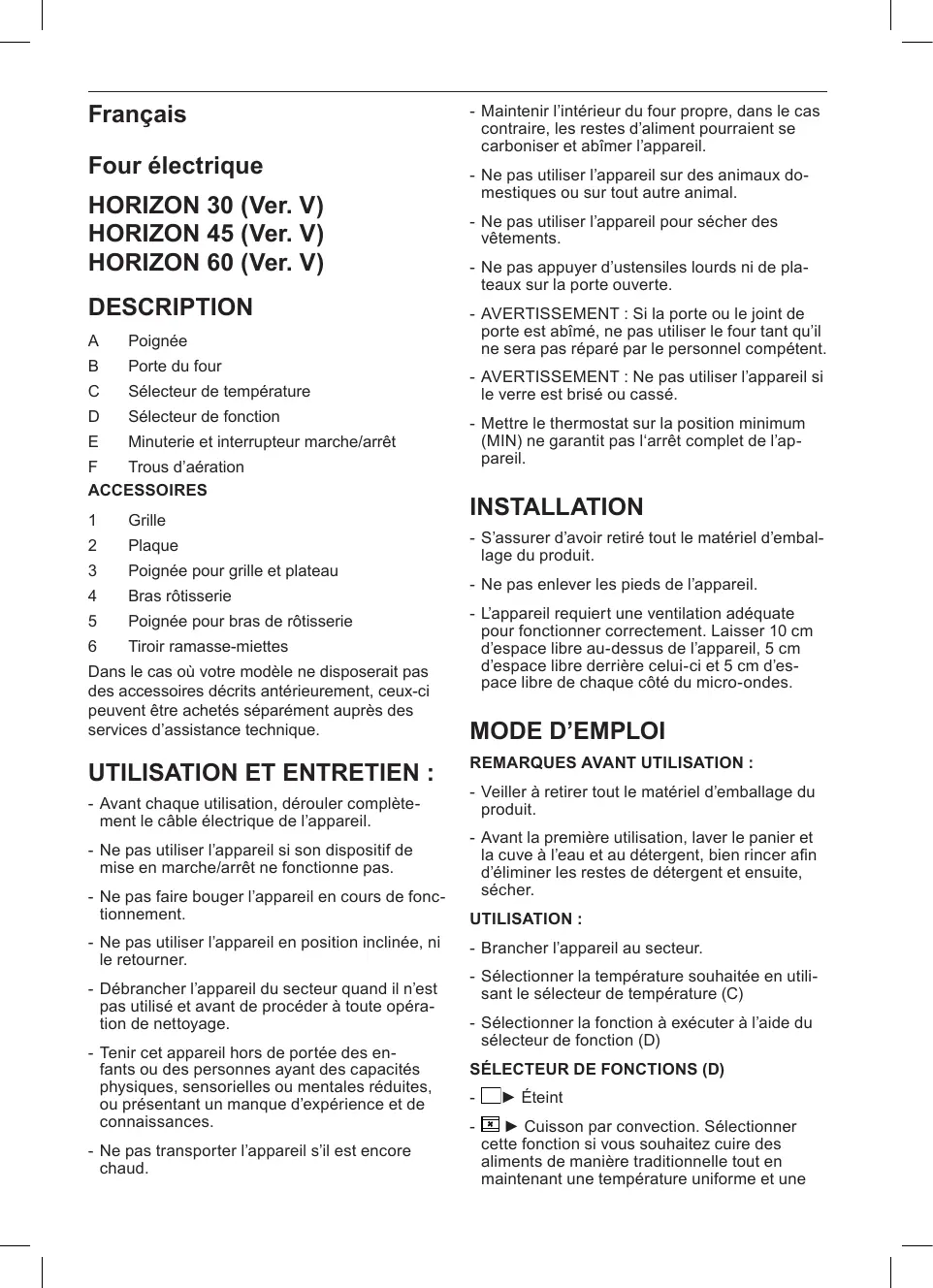 Français Four électrique HORIZON 30 (Ver. V) HORIZON 45 (Ver. V) HORIZON 60 (Ver. V) DESCRIPTION