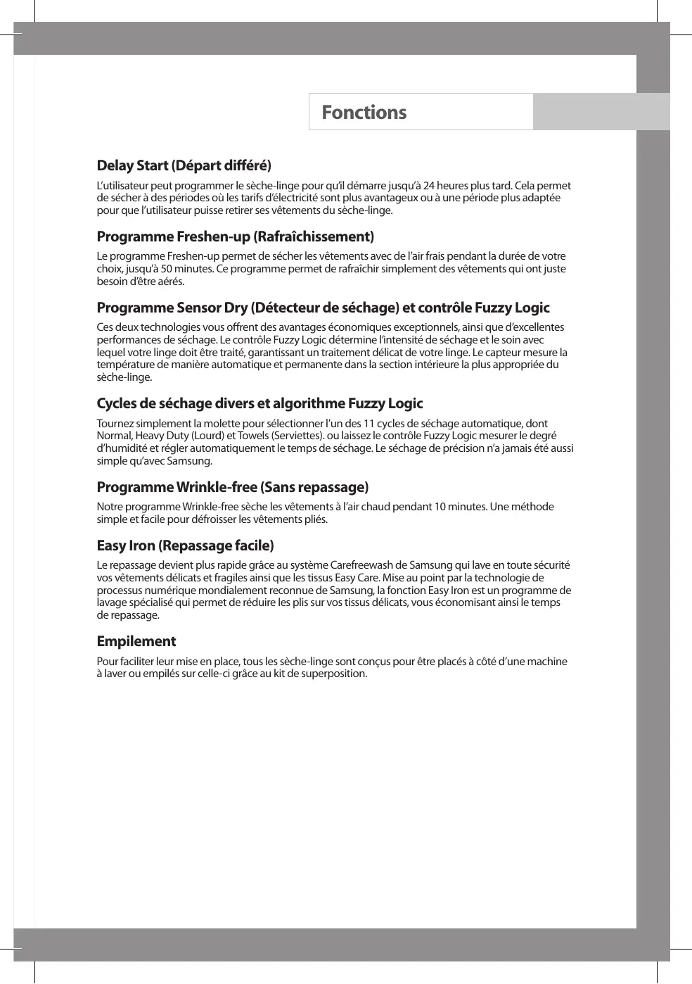 Sécheuse Guide de l’utilisateur DV665JW DV665JS Enregistrez vos produits Samsung en vous connectant sur : www.samsung.com/global/register Code No. : DC68-02369A-FR Fonctions Delay Start (Départ différé) L’utilisateur peut programmer le sèche-linge pour qu’il démarre jusqu’à 24 heures plus tard. Cela permet de sécher à des périodes où les tarifs d’électricité sont plus avantageux ou à une période plus adaptée pour que l’utilisateur puisse retirer ses vêtements du sèche-linge. Programme Freshen-up (Rafraîchissement) Le programme Freshen-up permet de sécher les vêtements avec de l’air frais pendant la durée de votre choix, jusqu’à 50 minutes. Ce programme permet de rafraîchir simplement des vêtements qui ont juste besoin d’être aérés. Programme Sensor Dry (Détecteur de séchage) et contrôle Fuzzy Logic Ces deux technologies vous offrent des avantages économiques exceptionnels, ainsi que d’excellentes performances de séchage. Le contrôle Fuzzy Logic détermine l’intensité de séchage et le soin avec lequel votre linge doit être traité, garantissant un traitement délicat de votre linge. Le capteur mesure la température de manière automatique et permanente dans la section intérieure la plus appropriée du sèche-linge. Cycles de séchage divers et algorithme Fuzzy Logic Tournez simplement la molette pour sélectionner l’un des 11 cycles de séchage automatique, dont Normal, Heavy Duty (Lourd) et Towels (Serviettes). ou laissez le contrôle Fuzzy Logic mesurer le degré d’humidité et régler automatiquement le temps de séchage. Le séchage de précision n’a jamais été aussi simple qu’avec Samsung. Programme Wrinkle-free (Sans repassage) Notre programme Wrinkle-free sèche les vêtements à l’air chaud pendant 10 minutes. Une méthode simple et facile pour défroisser les vêtements pliés. Easy Iron (Repassage facile) Le repassage devient plus rapide grâce au système Carefreewash de Samsung qui lave en toute sécurité vos vêtements délicats et fragiles ainsi que les tissus Easy Care. Mise au point par la technologie de processus numérique mondialement reconnue de Samsung, la fonction Easy Iron est un programme de lavage spécialisé qui permet de réduire les plis sur vos tissus délicats, vous économisant ainsi le temps de repassage. Empilement Pour faciliter leur mise en place, tous les sèche-linge sont conçus pour être placés à côté d’une machine à laver ou empilés sur celle-ci grâce au kit de superposition. Consignes de sécurité Félicitations pour l’achat de votre nouvelle sécheuse. Ce guide de l’utilisateur contient des renseignements utiles sur l’installation, l’usage et l’entretien de la sécheuse. Veuillez prendre le temps de lire ces instructions pour que vous puissiez tirer le maximum de profit des fonctions de la sécheuse et bénéficier de l’usage pendant de nombreuses années à venir. Avant d’utiliser la sécheuse