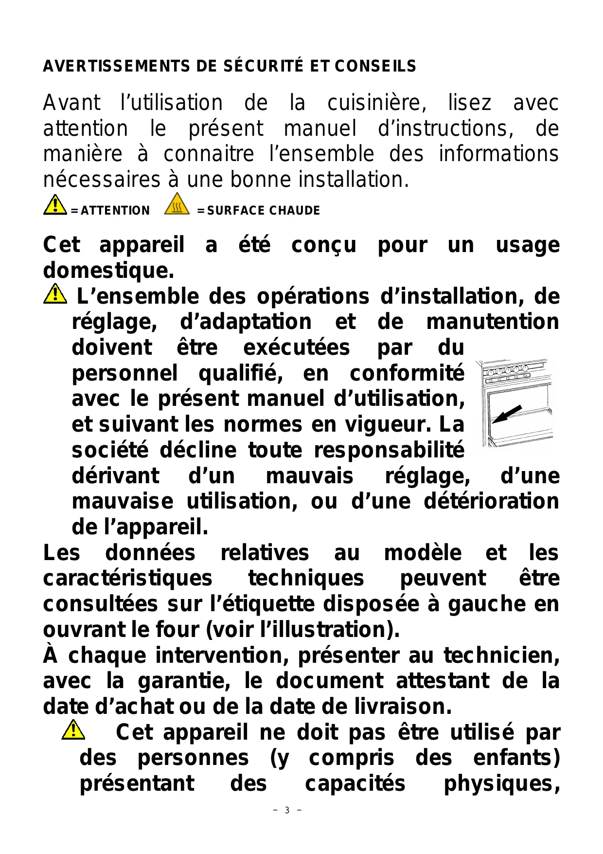Avant l’utilisation de la cuisinière, lisez avec attention le présent manuel d’instructions, de manière à connaitre l’ensemble des informations nécessaires à une bonne installation. = ATTENTION = SURFACE CHAUDE Cet appareil a été conçu pour un usage domestique. L’ensemble des opérations d’installation, de réglage, d’adaptation et de manutention doivent être exécutées par du personnel qualifié, en conformité avec le présent manuel d’utilisation, et suivant les normes en vigueur. La société décline toute responsabilité dérivant d’un mauvais réglage, d’une mauvaise utilisation, ou d’une détérioration de l’appareil. Les données relatives au modèle et les caractéristiques techniques peuvent être consultées sur l’étiquette disposée à gauche en ouvrant le four (voir l’illustration). À chaque intervention, présenter au technicien, avec la garantie, le document attestant de la date d’achat ou de la date de livraison. Cet appareil ne doit pas être utilisé par des personnes (y compris des enfants) présentant des capacités physiques,