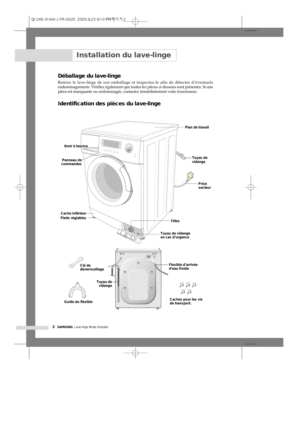 Table de matières Consignes de sécurité ----------------------------- Couverture intérieure Installation du lave-linge ------------------------------------------------------- 2 Déballage du lave-linge -------------------------------------------------------------------2 Identification des pièces et des accessoires -----------------------------------------2 Choix d’un emplacement ------------------------------------------------------------------3 Réglage des pieds de mise à niveau --------------------------------------------------3 Retrait des vis de transport ---------------------------------------------------------------3 Raccordement de l’arrivée d’eau -------------------------------------------------------4 Raccordement de l’arrivée d’eau (option) --------------------------------------------5 Positionnement du tuyau de vidange --------------------------------------------------5 Lavage -------------------------------------------------------------------------------- 6 Premier lavage -------------------------------------------------------------------------------6 Adjonction de détergent -------------------------------------------------------------------6 Panneau de commandes ------------------------------------------------------------------7 Programmation automatique des paramètres de cycles de lavage Fuzzy Logic ------9 Lavage en mode manuel -----------------------------------------------------------------10 Lavage différé ------------------------------------------------------------------------------10 Conseils et astuces -----------------------------------------------------------------------11 Précautions pour le programme couettes -------------------------------------------12 Entretien du lave-linge -------------------------------------------------------- 13 Vidange du lave-linge en cas d’urgence --------------------------------------------13 Réparation d'une arrivée d'eau gelée ------------------------------------------------13 Nettoyage des surfaces extérieures --------------------------------------------------13 Nettoyage du bac à produits -----------------------------------------------------------14 Nettoyage du filtre -------------------------------------------------------------------------14 Nettoyage du filtre à tamis du flexible ------------------------------------------------15 Dépannage ------------------------------------------------------------------------- 16 Problèmes et solutions -------------------------------------------------------------------16 Signification des messages d’erreur -------------------------------------------------16 Tableau des programmes----------------------------------------------------- 17 Annexe ------------------------------------------------------------------------------ 19 Tableau des symboles d’entretien ----------------------------------------------------19 Consignes électriques -------------------------------------------------------------------19 Protection de l’environnement ---------------------------------------------------------20 Déclaration de conformité ---------------------------------------------------------------20 Spécifications -------------------------------------------------------------------------------20 SAMSUNG Lave-linge Mode d’emploi 1 Installation du lave-linge Déballage du lave-linge Retirez le lave-linge de son emballage et inspectez-le afin de détecter d’éventuels endommagements. Vérifiez également que toutes les pièces ci-dessous sont présentes. Si une pièce est manquante ou endommagée, contactez immédiatement votre fournisseur. Identification des pièces du lave-linge Plan de travail tiroir à lessive Tuyau de vidange Panneau de commandes Prise secteur Cache inférieur Pieds réglables Filtre Tuyau de vidange en cas d’urgence Clé de déverrouillage Flexible d’arrivée d’eau froide Tuyau de vidange Guide du flexible 2 SAMSUNG Lave-linge Mode d’emploi Caches pour les vis de transport. Installation du lave-linge Choix d’un emplacement Avant d’installer le lave-linge, sélectionnez un emplacement présentant les caractéristiques suivantes :