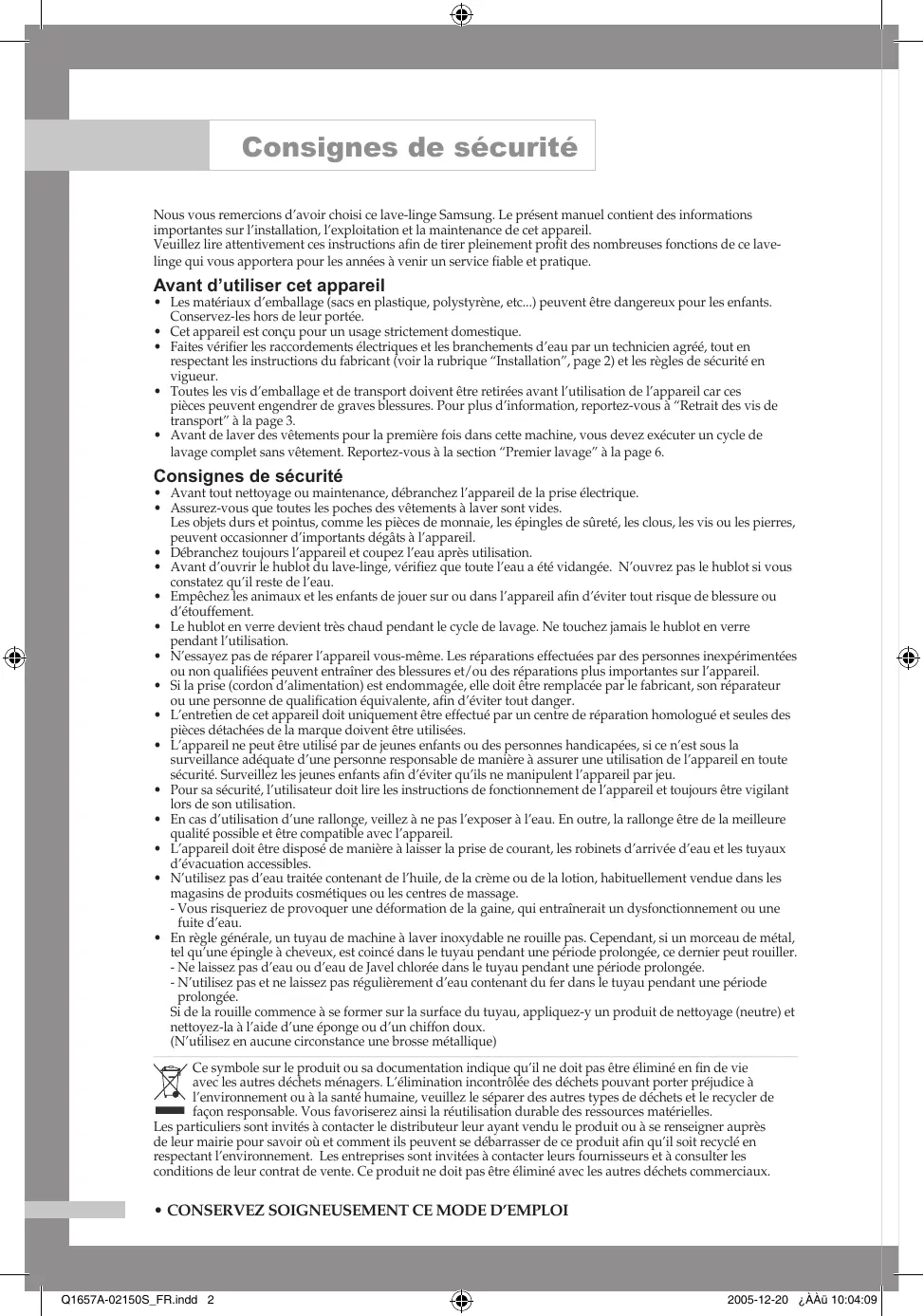 Lave-linge Mode d’emploi Q1657A(T/S/V) Q1457A(T/S/V) Enregistrez vos produits Samsung en vous connectant sur : www.samsung.com/global/register Code No.: DC68-02150S-FR Q1657A-02150S_FR.indd 1 2005-12-20 ¿ÀÀü 10:04:08 Consignes de sécurité Nous vous remercions d’avoir choisi ce lave-linge Samsung. Le présent manuel contient des informations importantes sur l’installation, l’exploitation et la maintenance de cet appareil. Veuillez lire attentivement ces instructions afin de tirer pleinement profit des nombreuses fonctions de ce lavelinge qui vous apportera pour les années à venir un service fiable et pratique. Avant d’utiliser cet appareil