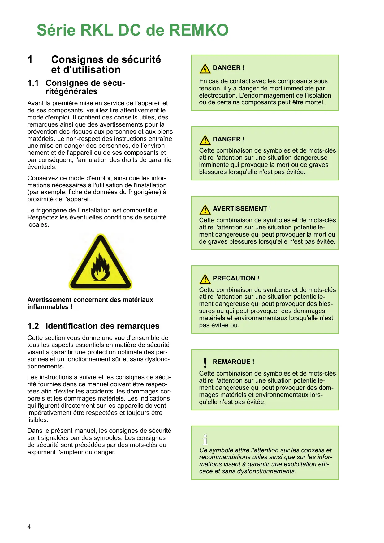 Le frigorégène de l'installation est combustible. Respectez les évventuelles conditions de sécurité locales.
