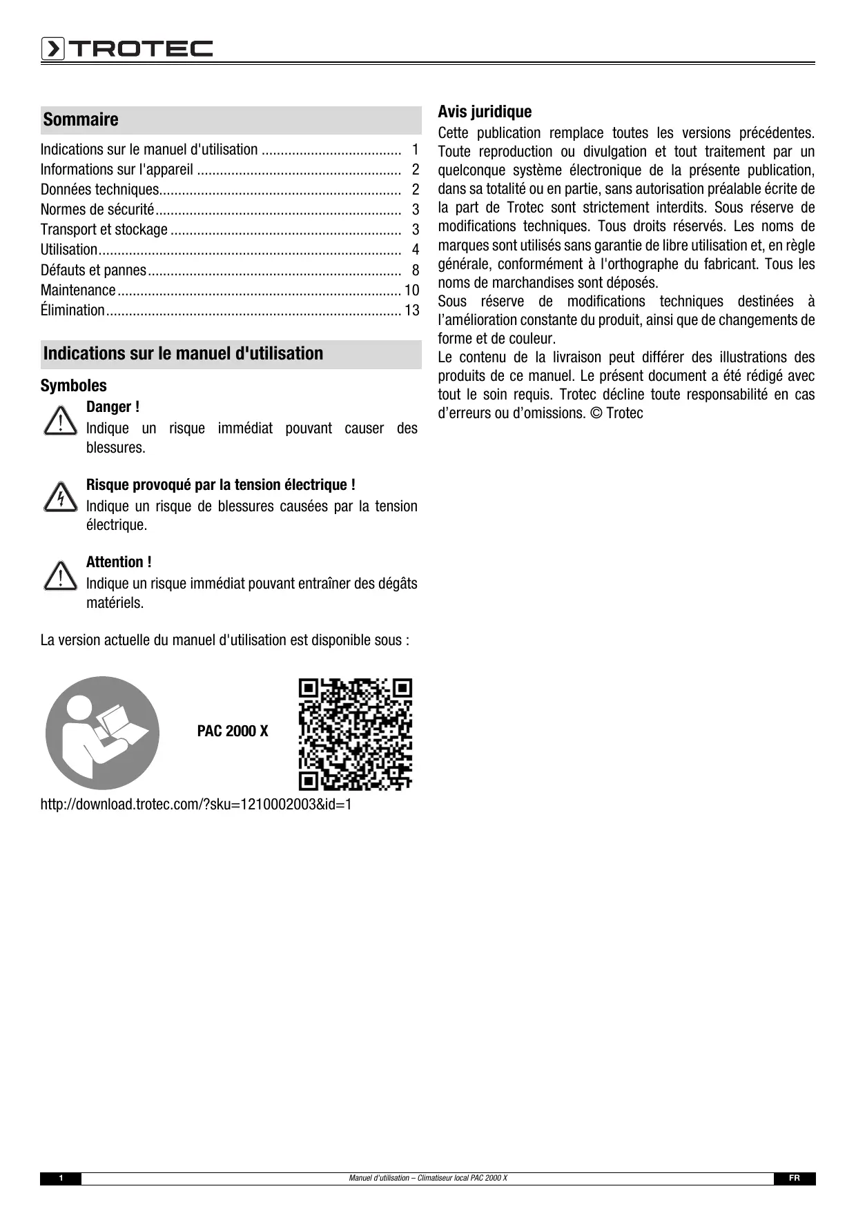 - Élimination Indications sur le manuel d'utilisation Symboles Danger ! Indique un risque immédiat pouvant causer des blessures. Cette publication remplace toutes les versions précédentes. Toute reproduction ou divulgation et tout traitement par un quelconque système électronique de la présente publication, dans sa totalité ou en partie, sans autorisation préalable écrite de la part de Trotec sont strictement interdits. Sous réserve de modifications techniques. Tous droits réservés. Les noms de marques sont utilisés sans garantie de libre utilisation et, en règle générale, conformément à l'orthographe du fabricant. Tous les noms de marchandises sont déposés. Sous réserve de modifications techniques destinées à l’amélioration constante du produit, ainsi que de changements de forme et de couleur. Le contenu de la livraison peut différer des illustrations des produits de ce manuel. Le présent document a été rédigé avec tout le soin requis. Trotec décline toute responsabilité en cas d’erreurs ou d’omissions. © Trotec Risque provoqué par la tension électrique ! Indique un risque de blessures causées par la tension électrique. Attention ! Indique un risque immédiat pouvant entraîner des dégâts matériels. La version actuelle du manuel d'utilisation est disponible sous : PAC 2000 X http://download.trotec.com/?sku=1210002003&id=1 p. 13