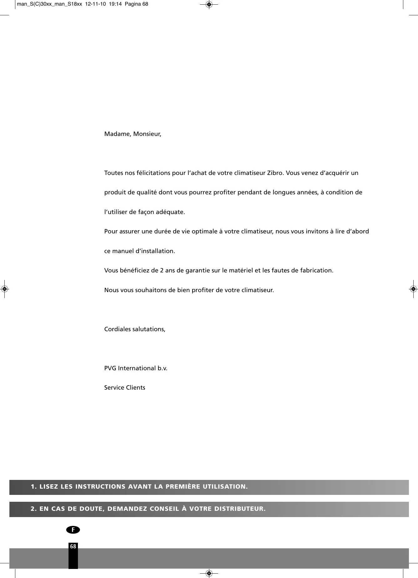 Pour assurer une durée de vie optimale à votre climatiseur, nous vous invitons à lire d’abord ce manuel d’installation. Vous bénéficiez de 2 ans de garantie sur le matériel et les fautes de fabrication. Nous vous souhaitons de bien profiter de votre climatiseur.