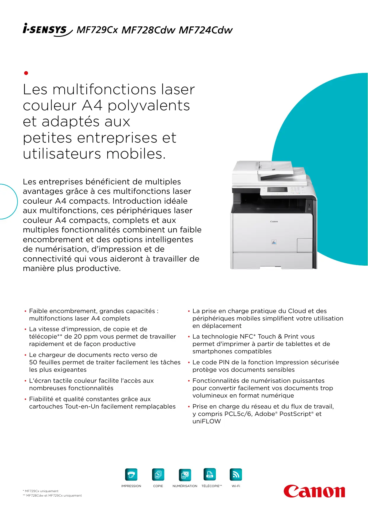 Les entreprises bénéficient de multiples avantages grâce à ces multifonctions laser couleur A4 compacts. Introduction idéale aux multifonctions, ces périphériques laser couleur A4 compacts, complets et aux multiples fonctionnalités combinent un faible encombrement et des options intelligentes de numérisation, d'impression et de connectivité qui vous aideront à travailler de manière plus productive.
