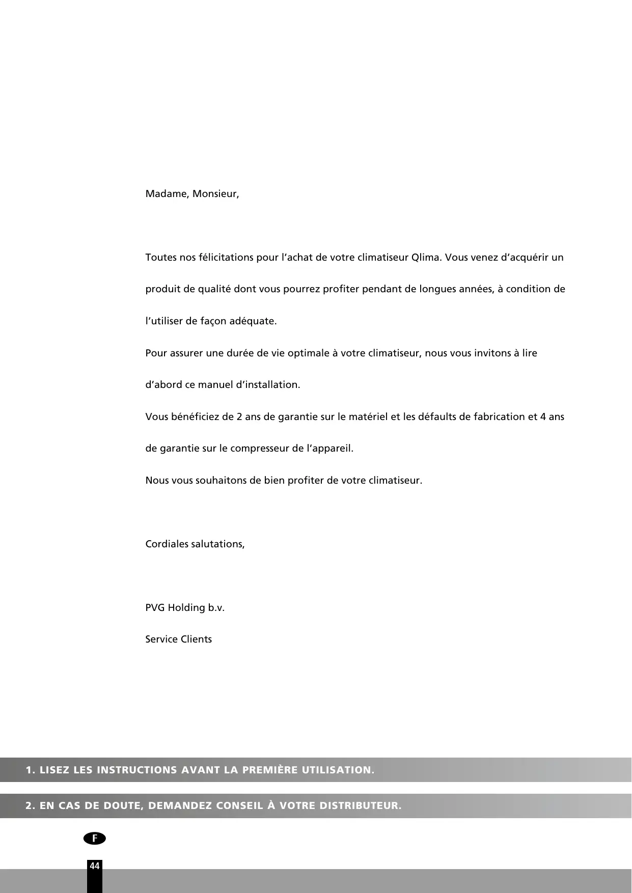 Pour assurer une durée de vie optimale à votre climatiseur, nous vous invitons à lire d’abord ce manuel d’installation. Vous bénéficiez de 2 ans de garantie sur le matériel et les défaults de fabrication et 4 ans de garantie sur le compresseur de l’appareil. Nous vous souhaitons de bien profiter de votre climatiseur.