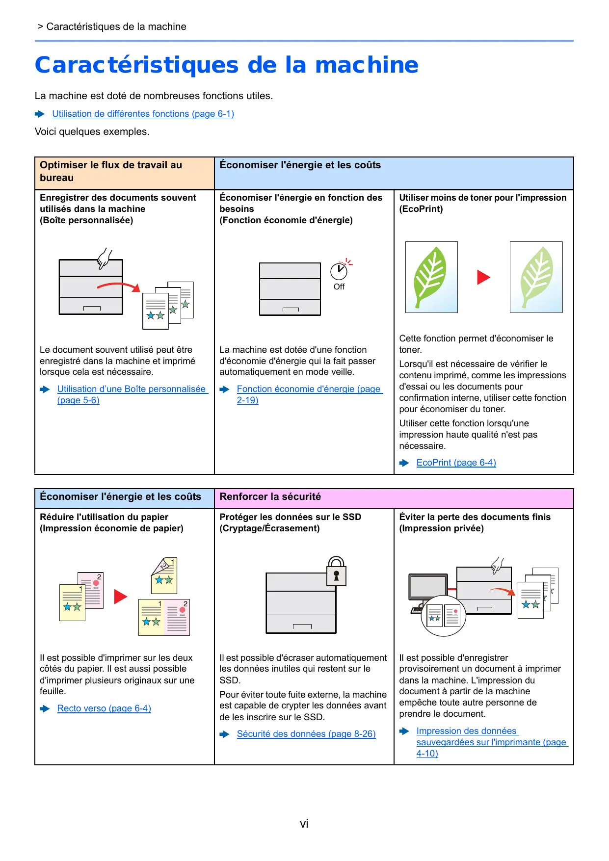 > Caractéristiques de la machine Caractéristiques de la machine La machine est doté de nombreuses fonctions utiles. Utilisation de différentes fonctions (page 6-1) Voici quelques exemples. Optimiser le flux de travail au bureau Économiser l'énergie et les coûts Enregistrer des documents souvent utilisés dans la machine (Boîte personnalisée) Économiser l'énergie en fonction des besoins (Fonction économie d'énergie) Utiliser moins de toner pour l'impression (EcoPrint) Off Le document souvent utilisé peut être enregistré dans la machine et imprimé lorsque cela est nécessaire. Utilisation d’une Boîte personnalisée (page 5-6) La machine est dotée d'une fonction d'économie d'énergie qui la fait passer automatiquement en mode veille. Fonction économie d'énergie (page 2-19) Cette fonction permet d'économiser le toner. Lorsqu'il est nécessaire de vérifier le contenu imprimé, comme les impressions d'essai ou les documents pour confirmation interne, utiliser cette fonction pour économiser du toner. Utiliser cette fonction lorsqu'une impression haute qualité n'est pas nécessaire. EcoPrint (page 6-4) Économiser l'énergie et les coûts Renforcer la sécurité Réduire l'utilisation du papier (Impression économie de papier) Protéger les données sur le SSD (Cryptage/Écrasement) Éviter la perte des documents finis (Impression privée) Il est possible d'imprimer sur les deux côtés du papier. Il est aussi possible d'imprimer plusieurs originaux sur une feuille. Il est possible d'écraser automatiquement les données inutiles qui restent sur le SSD. Il est possible d'enregistrer provisoirement un document à imprimer dans la machine. L'impression du document à partir de la machine empêche toute autre personne de prendre le document. Recto verso (page 6-4) Pour éviter toute fuite externe, la machine est capable de crypter les données avant de les inscrire sur le SSD. Sécurité des données (page 8-26)