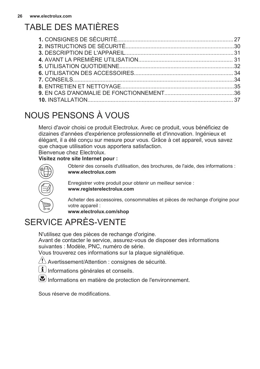 NOUS PENSONS À VOUS Merci d'avoir choisi ce produit Electrolux. Avec ce produit, vous bénéficiez de dizaines d'années d'expérience professionnelle et d'innovation. Ingénieux et