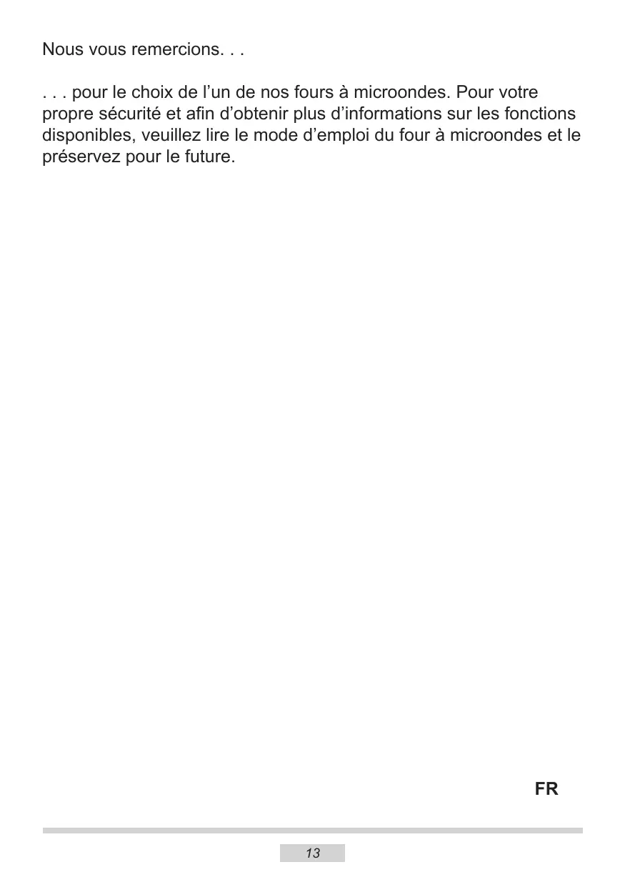 Afin d’éviter des endommagements et d’apprendre tous sur l’utilisation et les fonctions du four à microondes veuillez lire attentivement le mode d’emploi avant le montage et la mise en marche du four. Nous vous remercions. . . . . . pour le choix de l’un de nos fours à microondes. Pour votre propre sécurité et afin d’obtenir plus d’informations sur les fonctions disponibles, veuillez lire le mode d’emploi du four à microondes et le préservez pour le future.