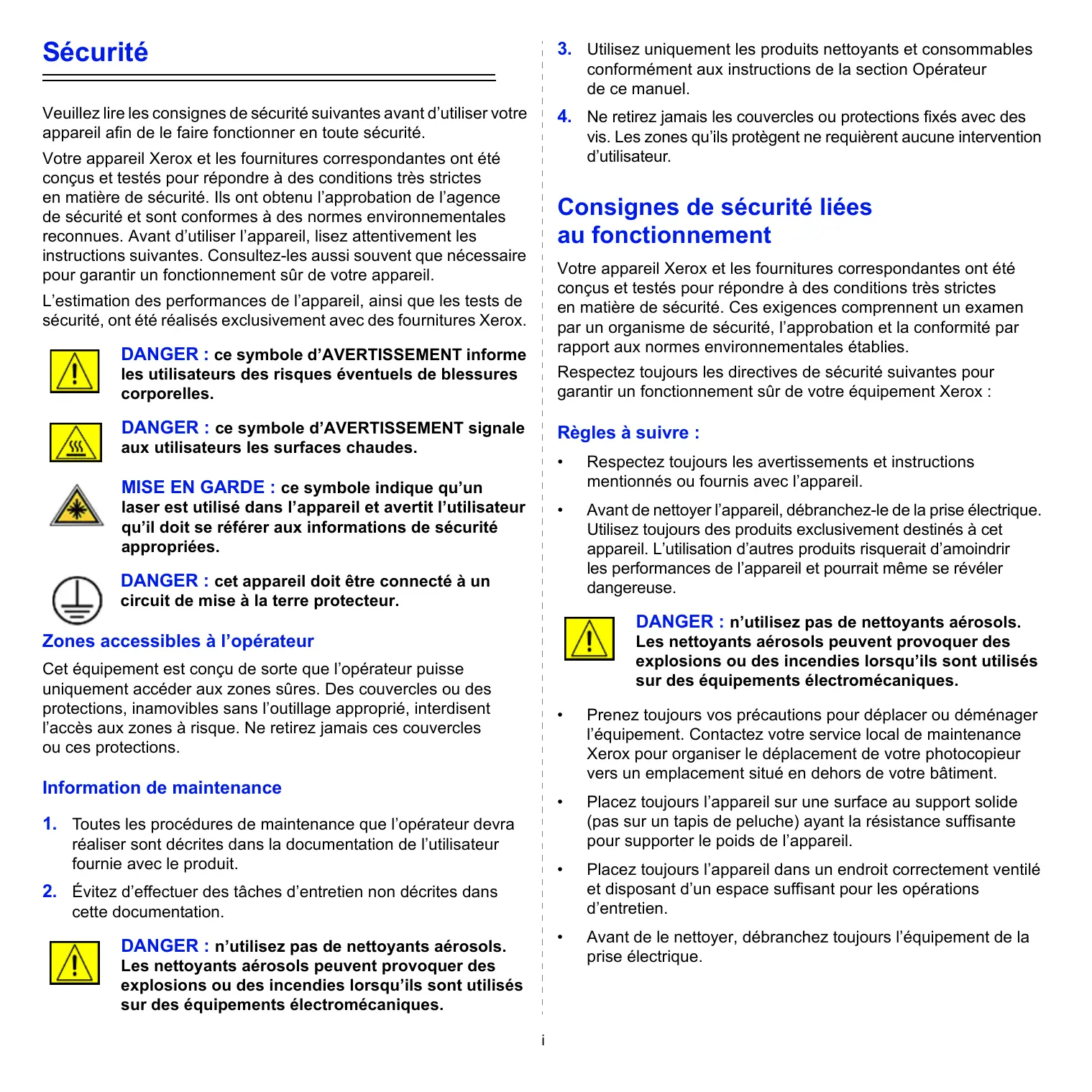 Votre appareil Xerox et les fournitures correspondantes ont été conçus et testés pour répondre à des conditions très strictes en matière de sécurité. Ils ont obtenu l’approbation de l’agence de sécurité et sont conformes à des normes environnementales reconnues. Avant d’utiliser l’appareil, lisez attentivement les instructions suivantes. Consultez-les aussi souvent que nécessaire pour garantir un fonctionnement sûr de votre appareil. Consignes de sécurité liées au fonctionnement conformément aux instructions de la section Opérateur de ce manuel. vis. Les zones qu’ils protègent ne requièrent aucune intervention d’utilisateur. Votre appareil Xerox et les fournitures correspondantes ont été conçus et testés pour répondre à des conditions très strictes en matière de sécurité. Ces exigences comprennent un examen par un organisme de sécurité, l’approbation et la conformité par rapport aux normes environnementales établies. L’estimation des performances de l’appareil, ainsi que les tests de sécurité, ont été réalisés exclusivement avec des fournitures Xerox.