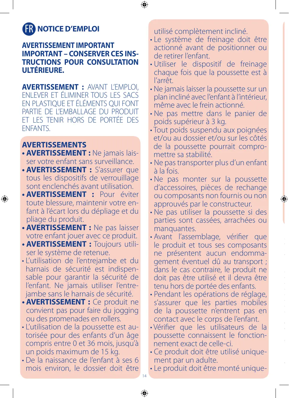 AVERTISSEMENT : AVANT L’EMPLOI, ENLEVER ET ÉLIMINER TOUS LES SACS EN PLASTIQUE ET ÉLÉMENTS QUI FONT PARTIE DE L’EMBALLAGE DU PRODUIT ET LES TENIR HORS DE PORTÉE DES ENFANTS. AVERTISSEMENTS • AVERTISSEMENT : Ne jamais laisser votre enfant sans surveillance. • AVERTISSEMENT : S’assurer que tous les dispositifs de verrouillage sont enclenchés avant utilisation. •AVERTISSEMENT : Pour éviter toute blessure, maintenir votre enfant à l’écart lors du dépliage et du pliage du produit. •AVERTISSEMENT : Ne pas laisser votre enfant jouer avec ce produit. • AVERTISSEMENT : Toujours utiliser le système de retenue. • L’utilisation de l’entrejambe et du harnais de sécurité est indispensable pour garantir la sécurité de l’enfant. Ne jamais utiliser l’entrejambe sans le harnais de sécurité. •A VERTISSEMENT : Ce produit ne convient pas pour faire du jogging ou des promenades en rollers. • L’utilisation de la poussette est autorisée pour des enfants d’un âge compris entre 0 et 36 mois, jusqu’à un poids maximum de 15 kg. • De la naissance de l’enfant à ses 6 mois environ, le dossier doit être 14