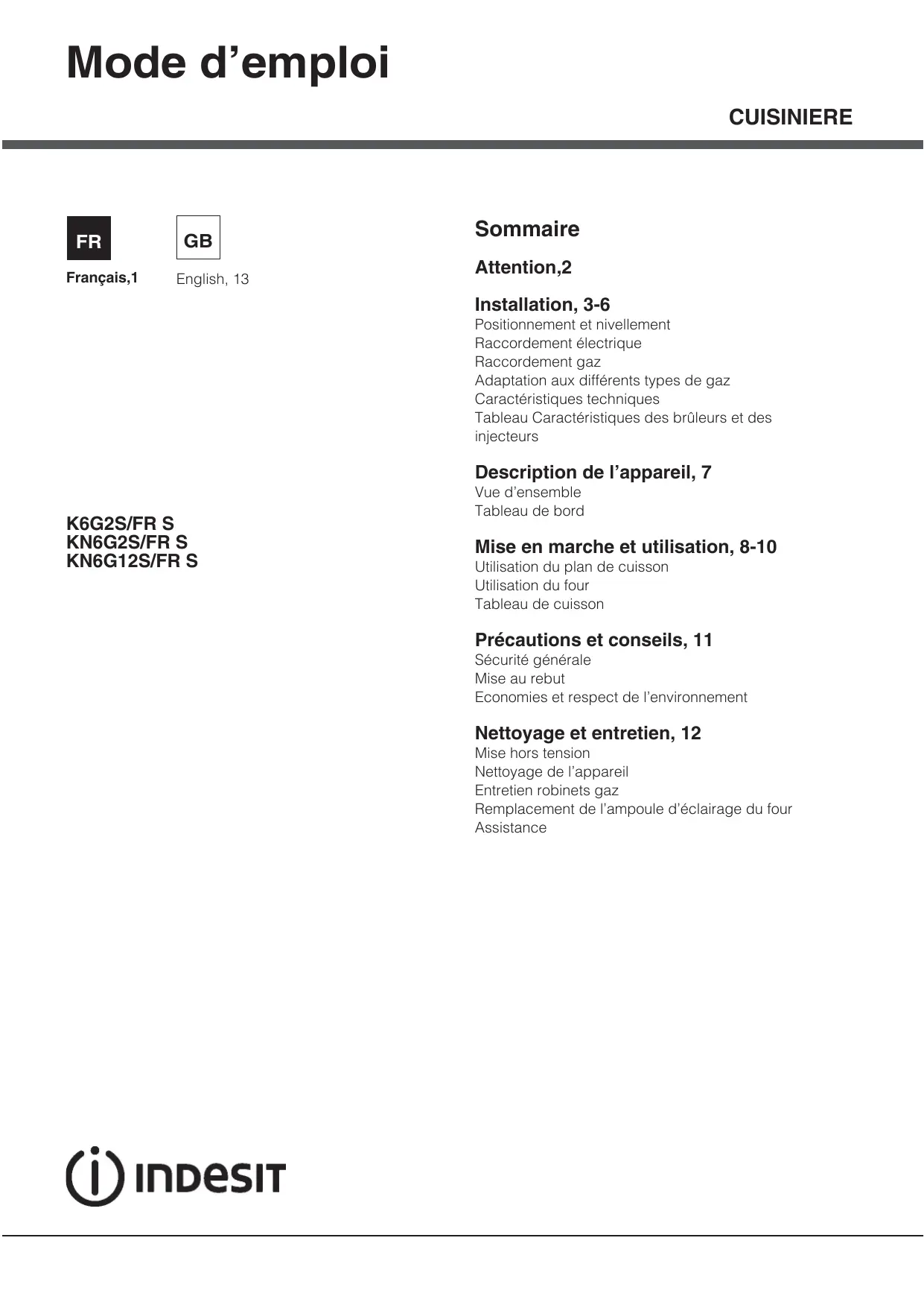 KN6G2SWFRS - Cuisinière INDESIT - Notice d'utilisation et mode d'emploi gratuit