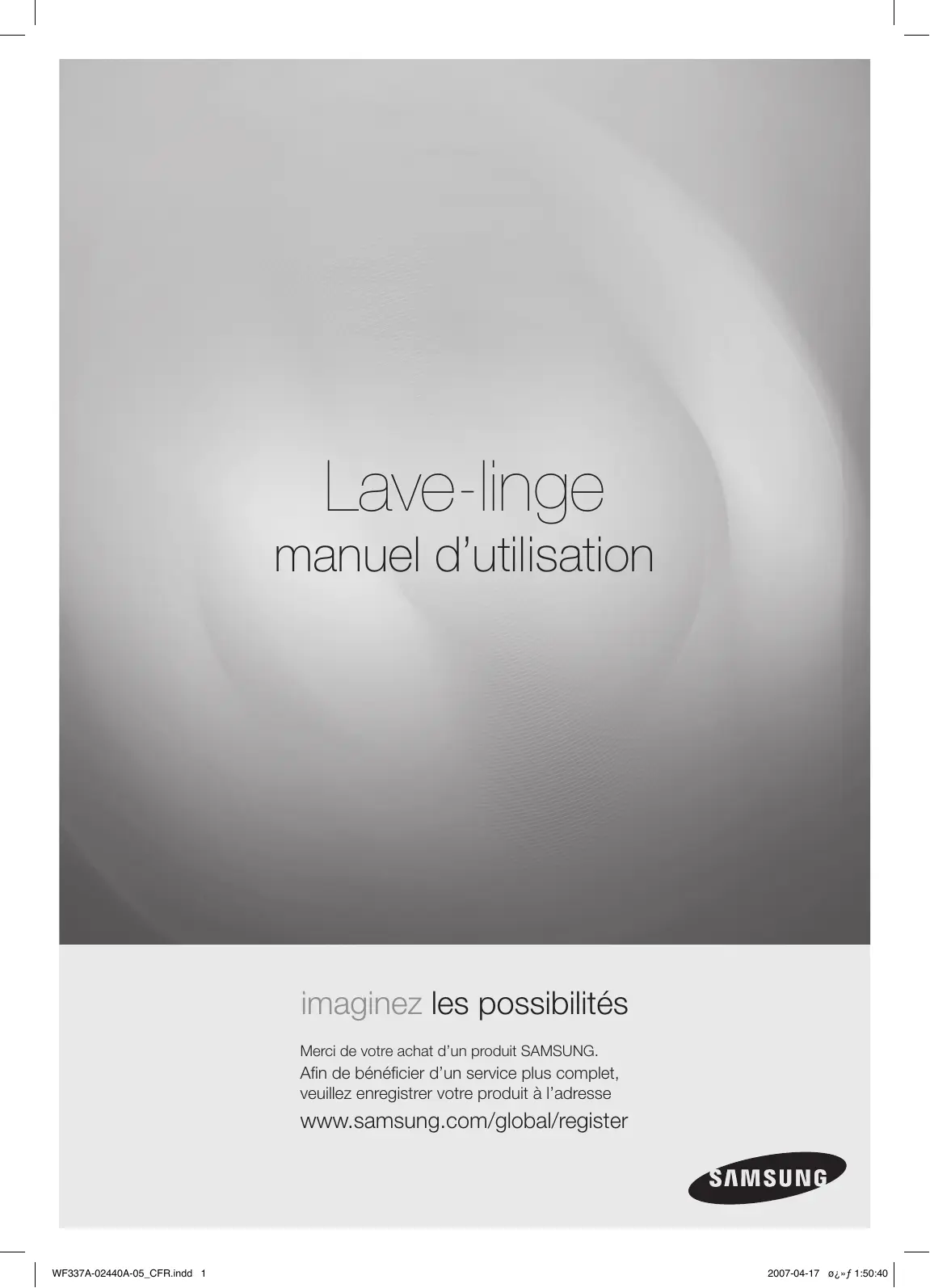 Lave-linge manuel d’utilisation imaginez les possibilités Merci de votre achat d’un produit SAMSUNG. Afin de bénéficier d’un service plus complet, veuillez enregistrer votre produit à l’adresse www.samsung.com/global/register WF337A-02440A-05_CFR.indd 1 2007-04-17 ø¿»ƒ 1:50:40 fonctions de votre nouveau lave-linge silvercare™