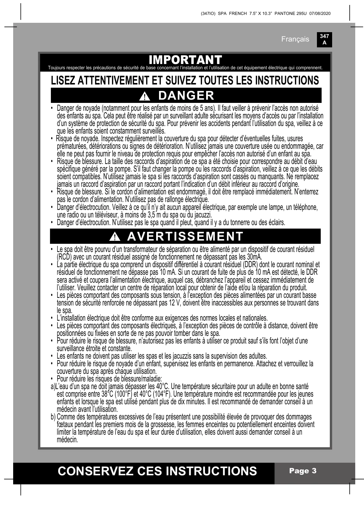 - Pour connaître toutes les instructions d’installation, de nettoyage et d’entretien de l’appareil, consultez les paragraphes ci-après de la notice. Lisez et suivez attentivement toutes ces instructions avant d’installer et d’utiliser ce produit. Ces avertissements, instructions et consignes de sécurité représentent des risques connus des loisirs d’eau, mais ils ne peuvent en aucun cas couvrir tous les cas. Soyez toujours prudent, utilisez votre bon sens et jugement lors d’activités d’eau. Conserver pour consultation future. Sécurité des non nageurs