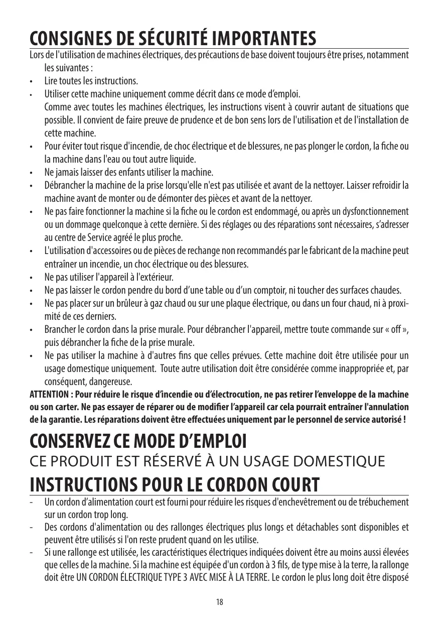 - Ne pas utiliser la machine à d'autres fins que celles prévues. Cette machine doit être utilisée pour un usage domestique uniquement. Toute autre utilisation doit être considérée comme inappropriée et, par conséquent, dangereuse. ATTENTION : Pour réduire le risque d’incendie ou d’électrocution, ne pas retirer l’enveloppe de la machine ou son carter. Ne pas essayer de réparer ou de modifier l’appareil car cela pourrait entraîner l'annulation de la garantie. Les réparations doivent être effectuées uniquement par le personnel de service autorisé !