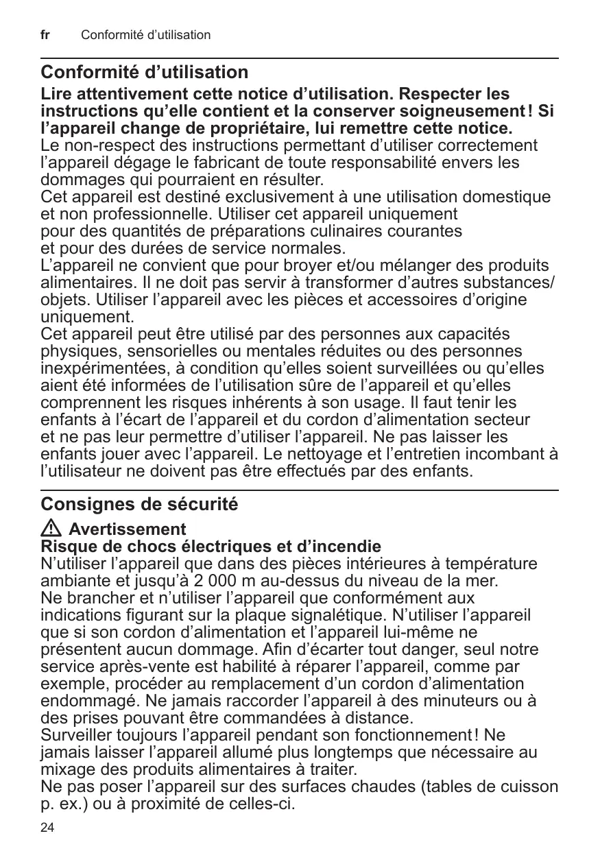 W Avertissement Risque de chocs électriques et d’incendie N’utiliser l’appareil que dans des pièces intérieures à température ambiante et jusqu’à 2 000 m au-dessus du niveau de la mer. Ne brancher et n’utiliser l’appareil que conformément aux indications figurant sur la plaque signalétique. N’utiliser l’appareil que si son cordon d’alimentation et l’appareil lui-même ne présentent aucun dommage. Afin d’écarter tout danger, seul notre service après-vente est habilité à réparer l’appareil, comme par exemple, procéder au remplacement d’un cordon d’alimentation endommagé. Ne jamais raccorder l’appareil à des minuteurs ou à des prises pouvant être commandées à distance. Surveiller toujours l’appareil pendant son fonctionnement ! Ne jamais laisser l’appareil allumé plus longtemps que nécessaire au mixage des produits alimentaires à traiter. Ne pas poser l’appareil sur des surfaces chaudes (tables de cuisson p. ex.) ou à proximité de celles-ci. 24