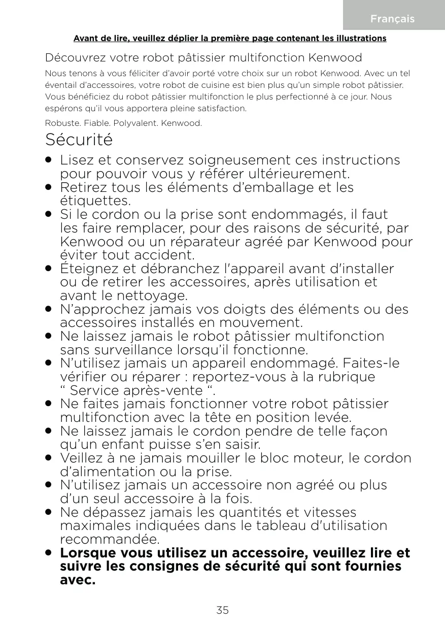 Nous tenons à vous féliciter d’avoir porté votre choix sur un robot Kenwood. Avec un tel éventail d’accessoires, votre robot de cuisine est bien plus qu’un simple robot pâtissier. Vous bénéficiez du robot pâtissier multifonction le plus perfectionné à ce jour. Nous espérons qu’il vous apportera pleine satisfaction. Robuste. Fiable. Polyvalent. Kenwood.