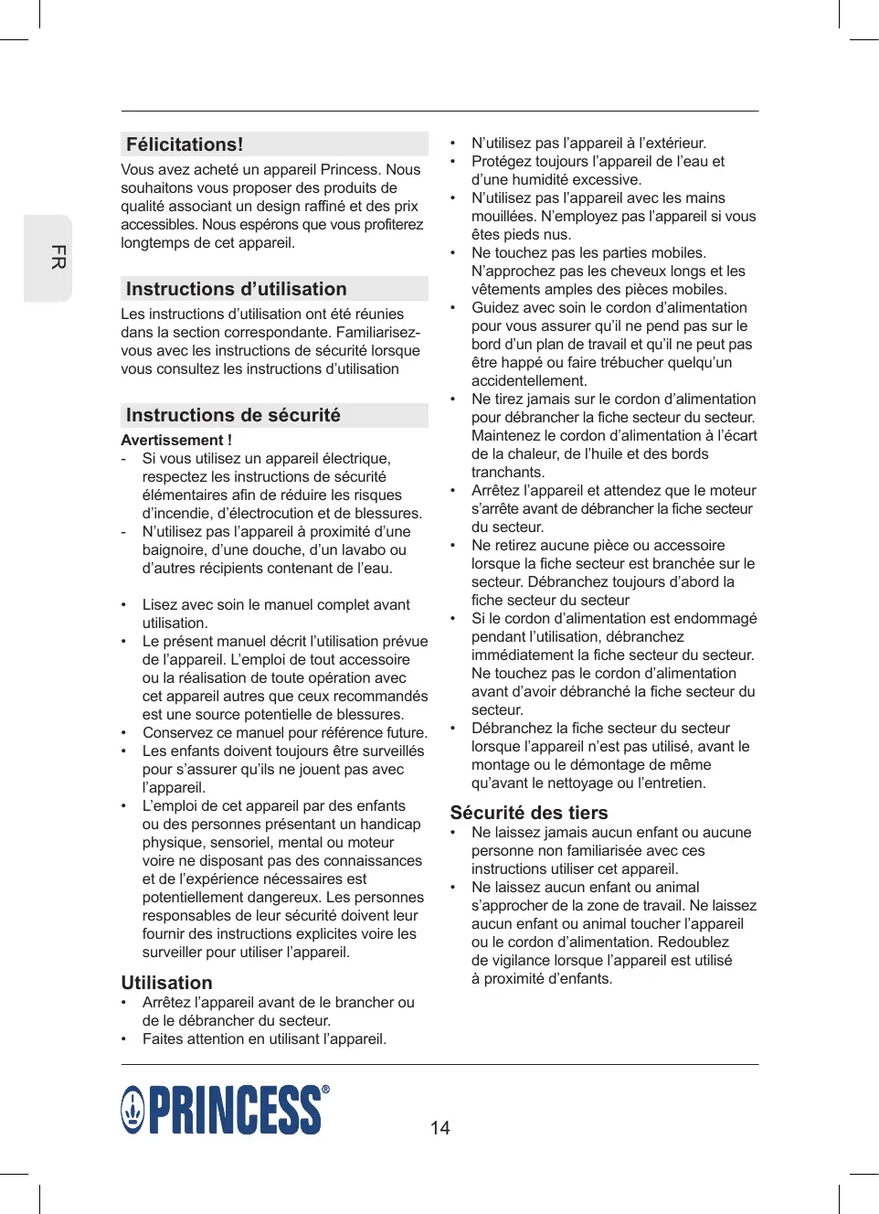 Vous avez acheté un appareil Princess. Nous souhaitons vous proposer des produits de qualité associant un design raffiné et des prix accessibles. Nous espérons que vous profiterez longtemps de cet appareil.