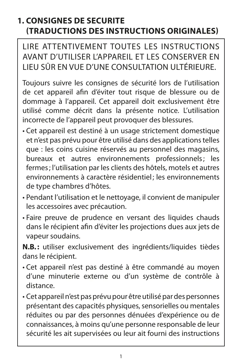 AVANT D’UTILISER L’APPAREIL ET LES CONSERVER EN LIEU SÛR EN VUE D’UNE CONSULTATION ULTÉRIEURE. Toujours suivre les consignes de sécurité lors de l’utilisation de cet appareil afin d’éviter tout risque de blessure ou de dommage à l’appareil. Cet appareil doit exclusivement être utilisé comme décrit dans la présente notice. L’utilisation incorrecte de l’appareil peut provoquer des blessures.