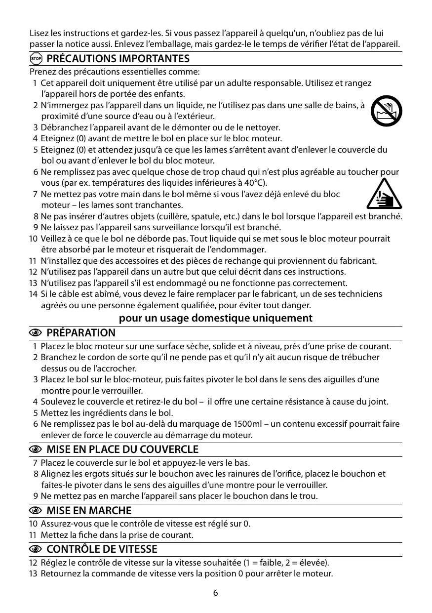 1 Cet appareil doit uniquement être utilisé par un adulte responsable. Utilisez et rangez l’appareil hors de portée des enfants. 2 N’immergez pas l’appareil dans un liquide, ne l’utilisez pas dans une salle de bains, à proximité d’une source d’eau ou à l’extérieur. 3 Débranchez l’appareil avant de le démonter ou de le nettoyer. 4 Eteignez (0) avant de mettre le bol en place sur le bloc moteur. 5 Eteignez (0) et attendez jusqu’à ce que les lames s’arrêtent avant d’enlever le couvercle du bol ou avant d’enlever le bol du bloc moteur. 6 Ne remplissez pas avec quelque chose de trop chaud qui n’est plus agréable au toucher pour vous (par ex. températures des liquides inférieures à 40°C). 7 Ne mettez pas votre main dans le bol même si vous l’avez déjà enlevé du bloc moteur – les lames sont tranchantes. 8 Ne pas insérer d’autres objets (cuillère, spatule, etc.) dans le bol lorsque l’appareil est branché. 9 Ne laissez pas l’appareil sans surveillance lorsqu’il est branché. 10 Veillez à ce que le bol ne déborde pas. Tout liquide qui se met sous le bloc moteur pourrait être absorbé par le moteur et risquerait de l’endommager. 11 N’installez que des accessoires et des pièces de rechange qui proviennent du fabricant. 12 N’utilisez pas l’appareil dans un autre but que celui décrit dans ces instructions. 13 N’utilisez pas l’appareil s’il est endommagé ou ne fonctionne pas correctement. 14 Si le câble est abîmé, vous devez le faire remplacer par le fabricant, un de ses techniciens agréés ou une personne également qualifiée, pour éviter tout danger.