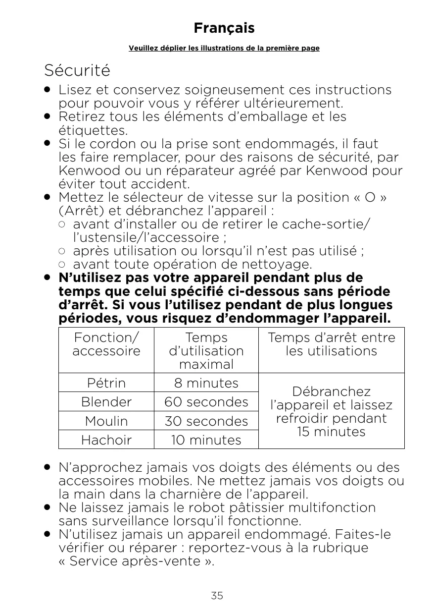 Français Veuillez déplier les illustrations de la première page Sécurité Lisez et conservez soigneusement ces instructions pour pouvoir vous y référer ultérieurement. O Retirez tous les éléments d’emballage et les étiquettes. O Si le cordon ou la prise sont endommagés, il faut les faire remplacer, pour des raisons de sécurité, par Kenwood ou un réparateur agréé par Kenwood pour éviter tout accident. O Mettez le sélecteur de vitesse sur la position « O » (Arrêt) et débranchez l’appareil : O avant d’installer ou de retirer le cache-sortie/ l’ustensile/l’accessoire ; O après utilisation ou lorsqu’il n’est pas utilisé ; O avant toute opération de nettoyage. O N’utilisez pas votre appareil pendant plus de temps que celui spécifié ci-dessous sans période d’arrêt. Si vous l’utilisez pendant de plus longues périodes, vous risquez d’endommager l’appareil. Fonction/ Temps Temps d’arrêt entre accessoire d’utilisation les utilisations maximal Pétrin 8 minutes Débranchez Blender 60 secondes l’appareil et laissez refroidir pendant Moulin 30 secondes 15 minutes Hachoir 10 minutes