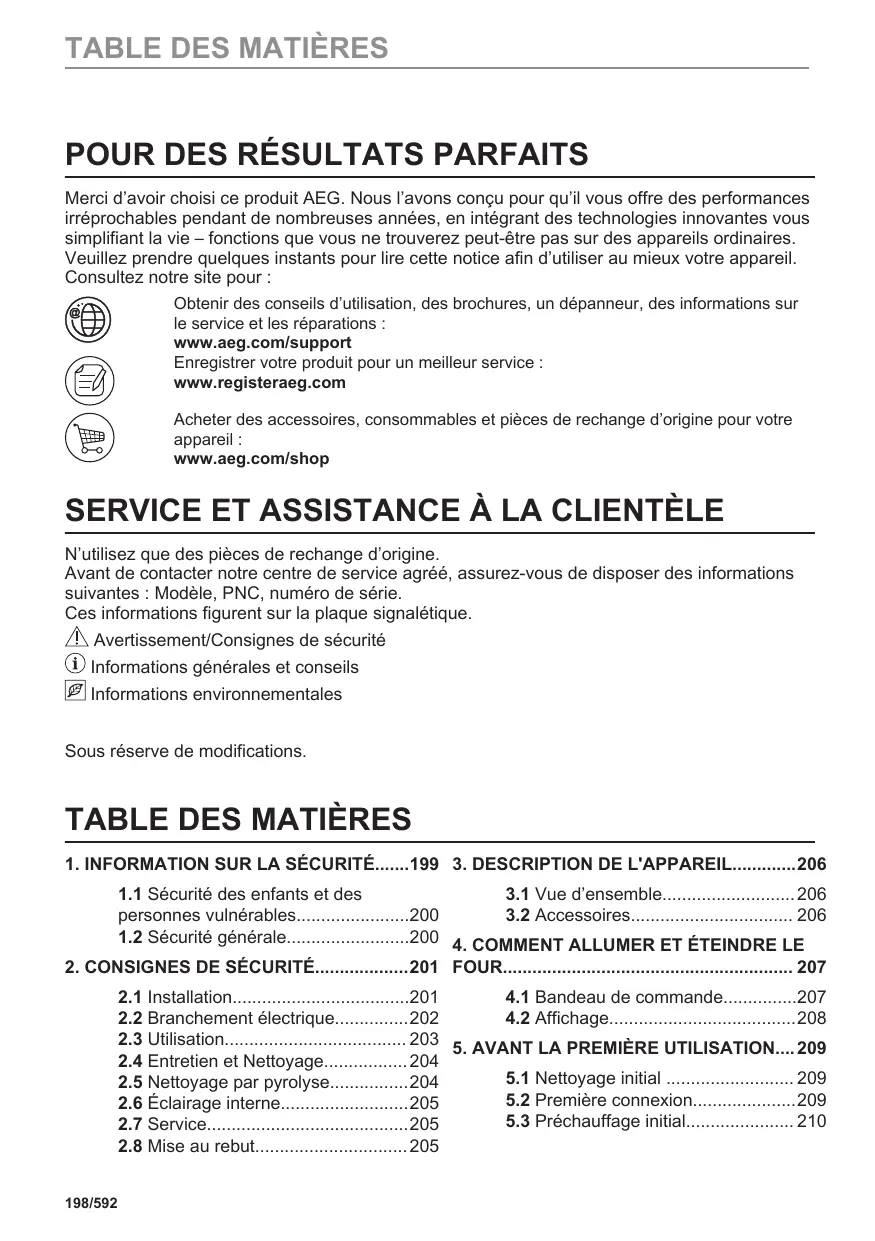 Merci d’avoir choisi ce produit AEG. Nous l’avons conçu pour qu’il vous offre des performances irréprochables pendant de nombreuses années, en intégrant des technologies innovantes vous simplifiant la vie – fonctions que vous ne trouverez peut-être pas sur des appareils ordinaires. Veuillez prendre quelques instants pour lire cette notice afin d’utiliser au mieux votre appareil. Consultez notre site pour : Obtenir des conseils d’utilisation, des brochures, un dépanneur, des informations sur le service et les réparations : www.aeg.com/support Enregistrer votre produit pour un meilleur service : www.registeraeg.com Acheter des accessoires, consommables et pièces de rechange d’origine pour votre appareil : www.aeg.com/shop