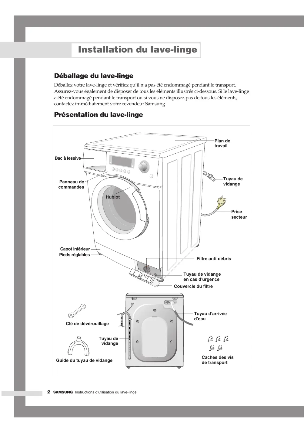 Table des matières Consignes de sécurité ------------------- couverture intérieure Installation du lave-linge ----------------------------------------------------- 2 Déballage du lave-linge -------------------------------------------------------------- 2 Présentation du lave-linge ----------------------------------------------------------- 2 Choix d'un emplacement ------------------------------------------------------------- 3 Réglage des pieds réglables -------------------------------------------------------- 3 Retrait des vis de transport ---------------------------------------------------------- 3 Raccordement du tuyau d’arrivée d’eau ----------------------------------------- 4 Positionnement du tuyau de vidange --------------------------------------------- 4 Lavage ------------------------------------------------------------------------------------ 5 Panneau de commandes ------------------------------------------------------------ 5 Premier lavage ---------------------------------------------------------------------------7 Adjonction de lessive dans le lave-linge ----------------------------------------- 7 Lavage du linge grâce à la fonction Fuzzy Logic ------------------------------ 8 Lavage en mode manuel ------------------------------------------------------------- 9 Départ différé ---------------------------------------------------------------------------- 9 Conseils et astuces ------------------------------------------------------------------ 10 Entretien du lave-linge ------------------------------------------------------ 11 Vidange du lave-linge en cas d'urgence ---------------------------------------- 11 Réparation d'un lave-linge gelé --------------------------------------------------- 11 Nettoyage des surfaces extérieures --------------------------------------------- 11 Nettoyage du bac à lessive -------------------------------------------------------- 12 Nettoyage du filtre anti-débris ----------------------------------------------------- 12 Nettoyage du filtre tamis du tuyau d'arrivée d'eau --------------------------- 13 Dépannage -------------------------------------------------------------------------- 14 Problèmes et solutions -------------------------------------------------------------- 14 Signification des messages d’erreur --------------------------------------------- 14 Tableau des programmes ---------------------------------------------- 15 Annexe --------------------------------------------------------------------------------- 17 Tableau des symboles textiles ---------------------------------------------------- 17 Précautions électriques ------------------------------------------------------------- 17 Protection de l’environnement ---------------------------------------------------- 18 Déclaration de conformité ---------------------------------------------------------- 18 Caractéristiques techniques ------------------------------------------------------- 18 SAMSUNG Instructions d’utilisation du lave-linge 1 Installation du lave-linge Déballage du lave-linge Déballez votre lave-linge et vérifiez qu’il n’a pas été endommagé pendant le transport. Assurez-vous également de disposer de tous les éléments illustrés ci-dessous. Si le lave-linge a été endommagé pendant le transport ou si vous ne disposez pas de tous les éléments, contactez immédiatement votre revendeur Samsung. Présentation du lave-linge Plan de travail Bac à lessive Tuyau de vidange Panneau de commandes Hublot Prise secteur Capot inférieur Pieds réglables Filtre anti-débris Tuyau de vidange en cas d'urgence Couvercle du filtre Tuyau d’arrivée d’eau Clé de dévérouillage Tuyau de vidange Guide du tuyau de vidange 2 SAMSUNG Instructions d’utilisation du lave-linge Caches des vis de transport Installation du lave-linge Choix d'un emplacement Avant d’installer votre lave-linge, choisissez un emplacement disposant des caractéristiques suivantes :