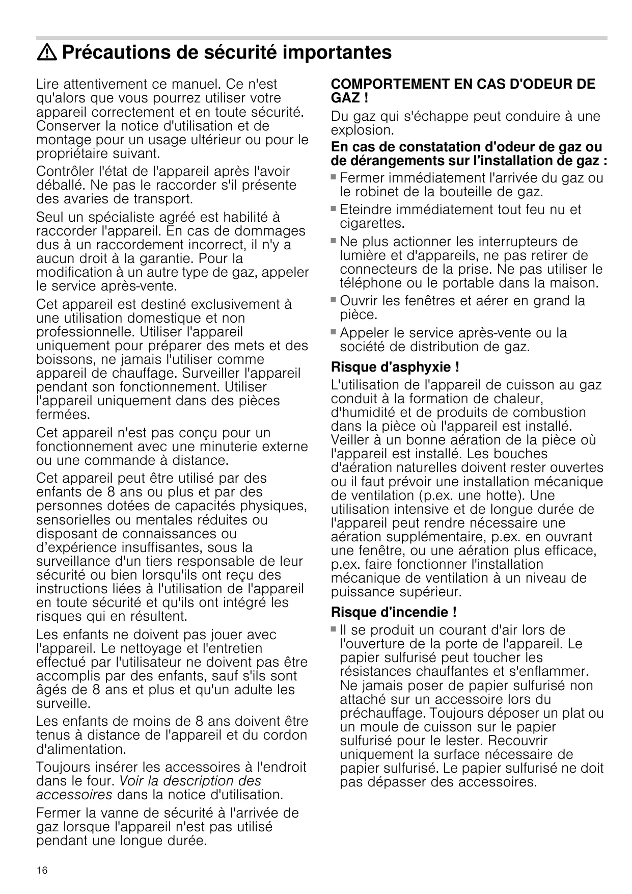 GAZ ! Du gaz qui s'échappe peut conduire à une explosion. En cas de constatation d'odeur de gaz ou de dérangements sur l'installation de gaz : ■ Fermer immédiatement l'arrivée du gaz ou le robinet de la bouteille de gaz. ■ Eteindre immédiatement tout feu nu et cigarettes. ■ Ne plus actionner les interrupteurs de lumière et d'appareils, ne pas retirer de connecteurs de la prise. Ne pas utiliser le téléphone ou le portable dans la maison. ■ Ouvrir les fenêtres et aérer en grand la pièce. ■ Appeler le service après-vente ou la société de distribution de gaz. Risque d'asphyxie ! L'utilisation de l'appareil de cuisson au gaz conduit à la formation de chaleur, d'humidité et de produits de combustion dans la pièce où l'appareil est installé. Veiller à un bonne aération de la pièce où l'appareil est installé. Les bouches d'aération naturelles doivent rester ouvertes ou il faut prévoir une installation mécanique de ventilation (p.ex. une hotte). Une utilisation intensive et de longue durée de l'appareil peut rendre nécessaire une aération supplémentaire, p.ex. en ouvrant une fenêtre, ou une aération plus efficace, p.ex. faire fonctionner l'installation mécanique de ventilation à un niveau de puissance supérieur. Risque d'incendie ! ■ Il se produit un courant d'air lors de l'ouverture de la porte de l'appareil. Le papier sulfurisé peut toucher les résistances chauffantes et s'enflammer. Ne jamais poser de papier sulfurisé non attaché sur un accessoire lors du préchauffage. Toujours déposer un plat ou un moule de cuisson sur le papier sulfurisé pour le lester. Recouvrir uniquement la surface nécessaire de papier sulfurisé. Le papier sulfurisé ne doit pas dépasser des accessoires. Risque d'incendie ! Des objets inflammables, rangés dans le compartiment de cuisson peuvent s'enflammer. Ne jamais conserver des objets inflammables dans le compartiment de cuisson. Ne jamais ouvrir la porte de l'appareil en cas de production de fumée dans l'appareil. Eteindre l'appareil et retirer la fiche secteur ou désactiver le fusible dans le boîtier à fusibles. Fermer l'arrivée de gaz. ■ L'huile et la graisse chaude s'enflamme rapidement. Ne jamais laisser l'huile et la graisse chaude sans surveillance. Ne jamais éteindre le feu avec de l'eau. Eteindre le foyer. Etouffer les flammes prudemment avec un couvercle, une couverture ou similaire. ■ Les foyers deviennent très chauds. Ne jamais poser des objets inflammables sur la table de cuisson. Ne pas conserver des objets sur la table de cuisson. ■ L'appareil devient très chaud, des matières inflammables peuvent s'enflammer. Ne jamais ranger ou utiliser des objets inflammables (p.ex. aérosols , nettoyants) en-dessous de l’appareil ou à proximité. Ne jamais poser des objets inflammables sur ou dans l'appareil. ■ Des foyers à gaz sans qu'un récipient ne soit placé sur le foyer dégagent une forte chaleur lors du fonctionnement. L'appareil et une hotte située au-dessus peuvent être endommagés ou il y a risque de feu. Les résidus de graisse contenus dans le filtre de la hotte peuvent s'enflammer. Utiliser les foyers à gaz uniquement avec un récipient placé dessus. ■ La face arrière de l'appareil devient très chaud. Cela peut conduire à un endommagement des conduites de raccordement. Les conduites électrique et de gaz ne doivent pas toucher la face arrière de l'appareil. Risque de brûlure ! ■ L'appareil devient très chaud. Ne jamais toucher les surfaces intérieures chaudes du compartiment de cuisson ni les résistances chauffantes. Toujours laisser l'appareil refroidir. Tenir les enfants éloignés ■ Les récipients ou les accessoires deviennent très chaud. Toujours utiliser des maniques pour retirer le récipient ou les accessoires du compartiment de cuisson.