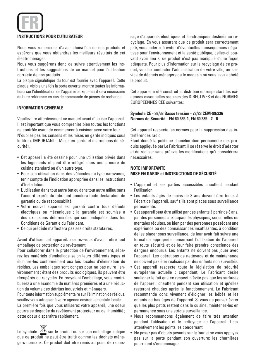 Normes de Sécurité - EN 60 335-1, EN 60 335 - 2 - 6 Cet appareil respecte les normes pour la suppression des interférences radio. Étant donné la politique d’amélioration permanente des produits appliquée par Le Fabricant, il se réserve le droit d’adapter et de réaliser sans préavis les modifications qu’i considèrera nécessaires. NOTE IMPORTANTE MISE EN GARDE et INSTRUCTIONS DE SÉCURITÉ • L'appareil et ses parties accessibles chauffent pendant l'utilisation. • Les enfants âgés de moins de 8 ans doivent être tenus à l'écart de l'appareil, sauf s'ils sont placés sous surveillance permanente. • Cet appareil peut être utilisé par des enfants à partir de 8 ans, par des personnes aux capacités physiques, sensorielles ou mentales réduites, ou bien par des personnes possédant une expérience ou des connaissances insuffisantes, à condition de les placer sous surveillance, de leur avoir fait suivre une formation appropriée concernant l'utilisation de l'appareil en toute sécurité et de leur faire prendre conscience des dangers encourus. Les enfants ne doivent pas jouer avec l'appareil. Les opérations de nettoyage et de maintenance ne doivent pas être réalisées par des enfants non surveillés. • Cet appareil respecte toute la législation de sécurité européenne actuelle ; cependant, Le Fabricant désire souligner le fait que ce respect n’évite pas que les surfaces de l’appareil chauffent pendant son utilisation et qu’elles resteront chaudes après le fonctionnement. Le Fabricant recommande donc vivement d’éloigner les bébés et les enfants de bas âges de l’appareil. Si vous ne pouvez éviter que les plus petits restent dans la cuisine, maintenez-les en permanence sous une stricte surveillance. • Nous recommandons également de faire très attention pendant l’utilisation et le nettoyage de l’appareil. Lisez attentivement les points les concernant. • Ne posez pas d’objets pesants sur le four et ne vous appuyez pas sur la porte pendant son ouverture: les charnières pourraient s’endommager.