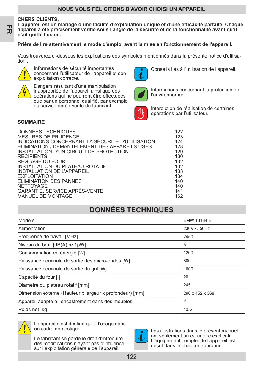 Modèle EMW 13184 E Alimentation 230V~ / 50Hz Fréquence de travail [MHz]