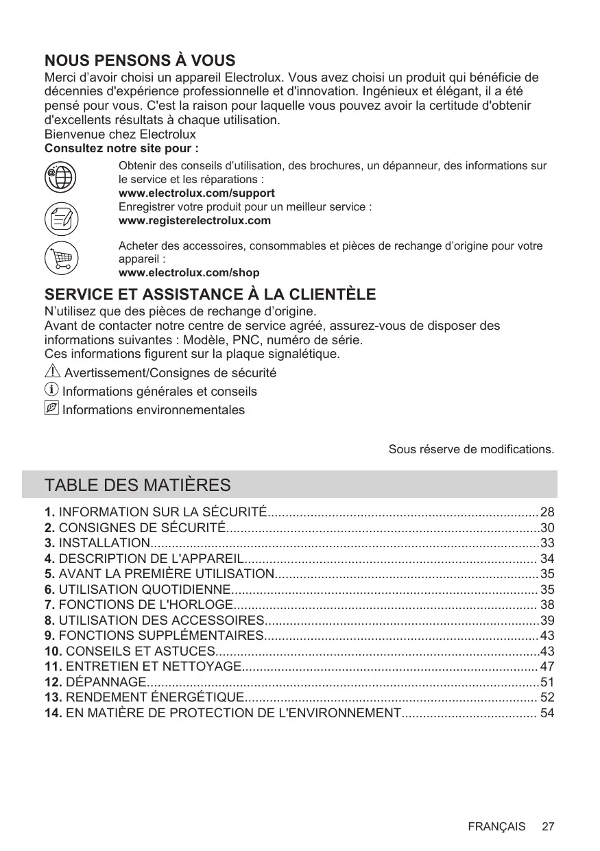 Merci d’avoir choisi un appareil Electrolux. Vous avez choisi un produit qui bénéficie de décennies d'expérience professionnelle et d'innovation. Ingénieux et élégant, il a été pensé pour vous. C'est la raison pour laquelle vous pouvez avoir la certitude d'obtenir d'excellents résultats à chaque utilisation.