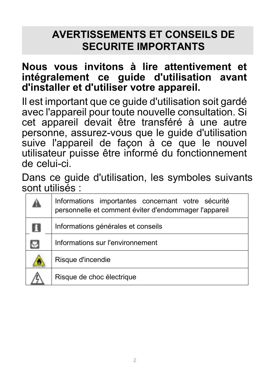 SECURITE IMPORTANTS Nous vous invitons à lire attentivement et intégralement ce guide d'utilisation avant d'installer et d'utiliser votre appareil. Il est important que ce guide d'utilisation soit gardé avec l'appareil pour toute nouvelle consultation. Si cet appareil devait être transféré à une autre personne, assurez-vous que le guide d'utilisation suive l'appareil de façon à ce que le nouvel utilisateur puisse être informé du fonctionnement de celui-ci. Dans ce guide d'utilisation, les symboles suivants sont utilisés : Informations importantes concernant votre sécurité personnelle et comment éviter d'endommager l'appareil Informations générales et conseils Informations sur l'environnement Risque d'incendie Risque de choc électrique
