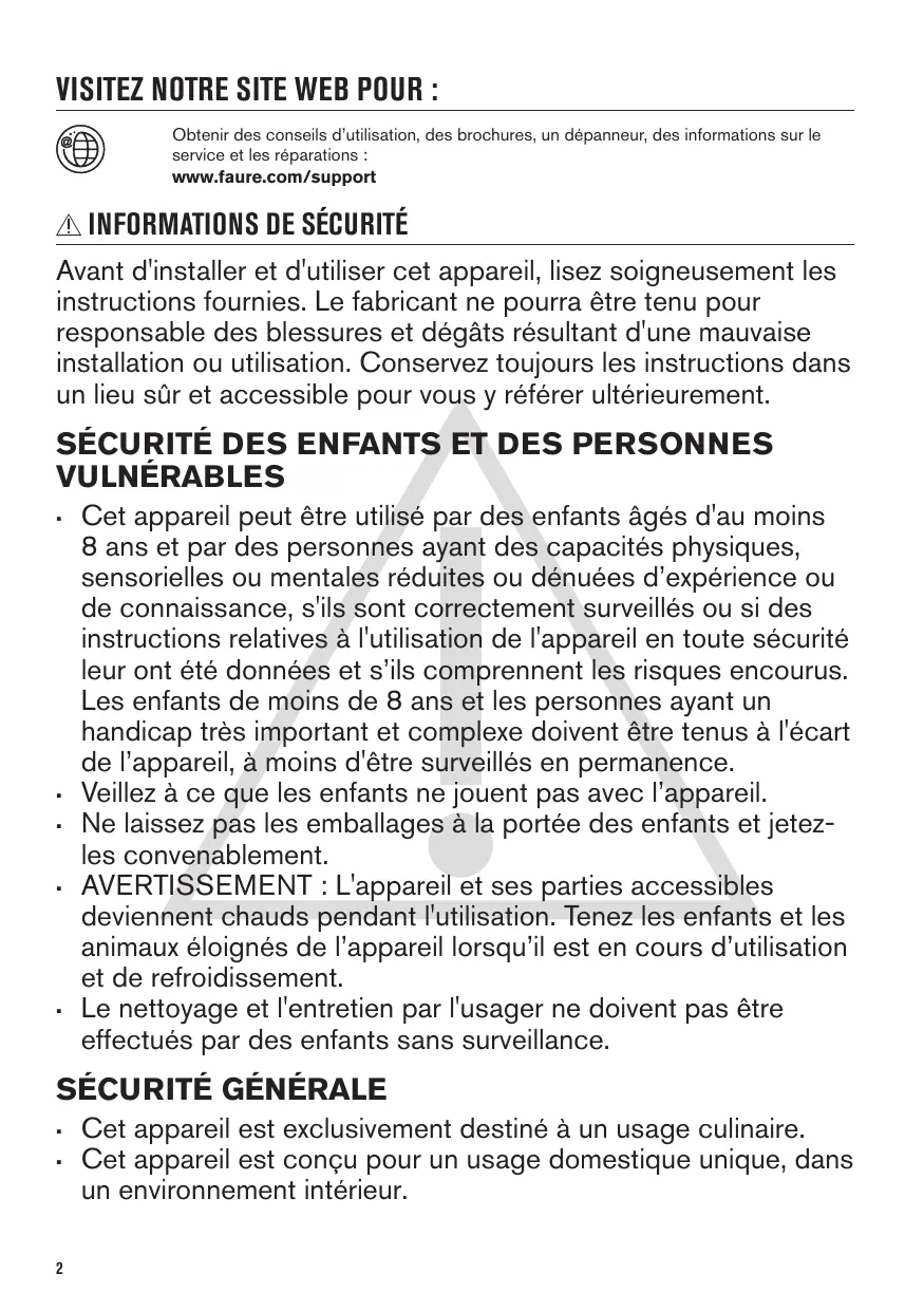 Avant d'instructor et d'utiliser cet apparéil, lisez soigneusement les instructions fournies. Le fabricant ne pourrait être tenu pour responsable des blessures et dégâtés résultats d'une mauvaise installation ou utilisation. Conservez toujours les instructions dans un lieu sur et accessible pour vous y référer ultérieurement.