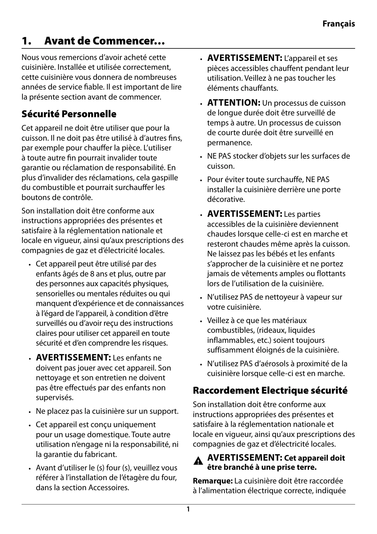Avant de Commencer… Nous vous remercions d’avoir acheté cette cuisinière. Installée et utilisée correctement, cette cuisinière vous donnera de nombreuses années de service fiable. Il est important de lire la présente section avant de commencer.