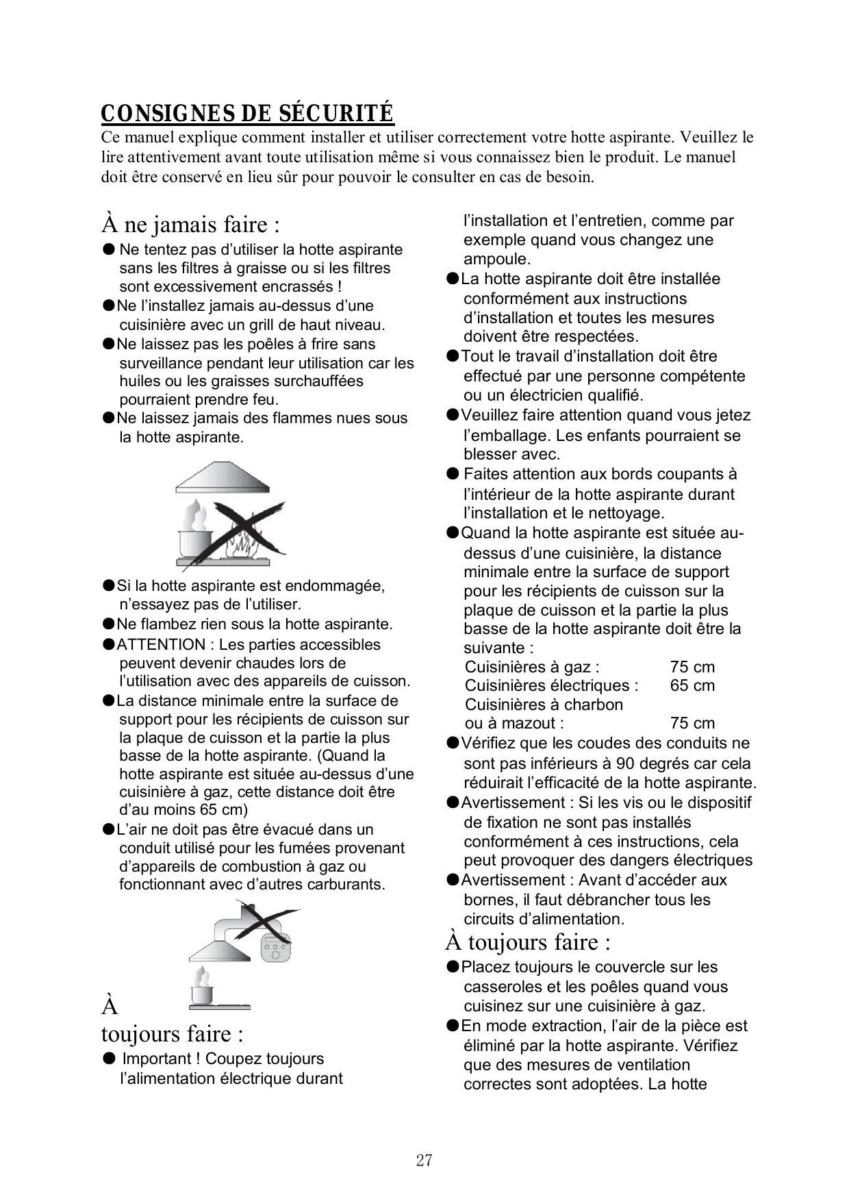 ●La hotte aspirante doit être installée conformément aux instructions d’installation et toutes les mesures doivent être respectées. ●Tout le travail d’installation doit être effectué par une personne compétente ou un électricien qualifié. ●Veuillez faire attention quand vous jetez l’emballage. Les enfants pourraient se blesser avec. ● Faites attention aux bords coupants à l’intérieur de la hotte aspirante durant l’installation et le nettoyage. ●Quand la hotte aspirante est située audessus d’une cuisinière, la distance minimale entre la surface de support pour les récipients de cuisson sur la plaque de cuisson et la partie la plus basse de la hotte aspirante doit être la suivante : Cuisinières à gaz : 75 cm Cuisinières électriques : 65 cm Cuisinières à charbon ou à mazout : 75 cm ●Vérifiez que les coudes des conduits ne sont pas inférieurs à 90 degrés car cela réduirait l’efficacité de la hotte aspirante. ●Avertissement : Si les vis ou le dispositif de fixation ne sont pas installés conformément à ces instructions, cela peut provoquer des dangers électriques ●Avertissement : Avant d’accéder aux bornes, il faut débrancher tous les circuits d’alimentation.