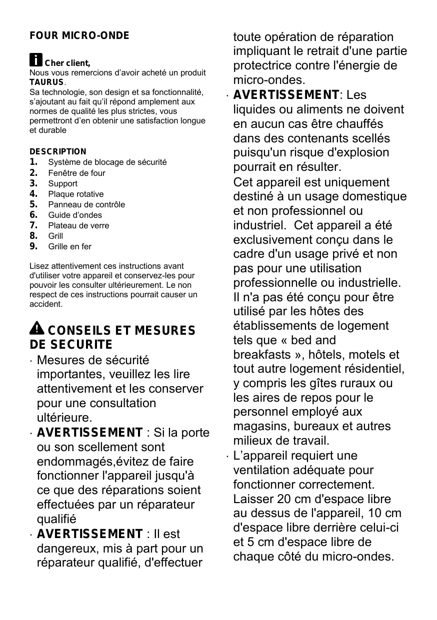 Nous vous remercions d’avoir acheté un produit TAURUS. Sa technologie, son design et sa fonctionnalité, s’ajoutant au fait qu’il répond amplement aux normes de qualité les plus strictes, vous permettront d’en obtenir une satisfaction longue et durable DESCRIPTION 1. Système de blocage de sécurité 2. Fenêtre de four 3. Support 4. Plaque rotative 5. Panneau de contrôle 6. Guide d’ondes 7. Plateau de verre 8. Grill 9. Grille en fer Lisez attentivement ces instructions avant d'utiliser votre appareil et conservez-les pour pouvoir les consulter ultérieurement. Le non respect de ces instructions pourrait causer un accident.