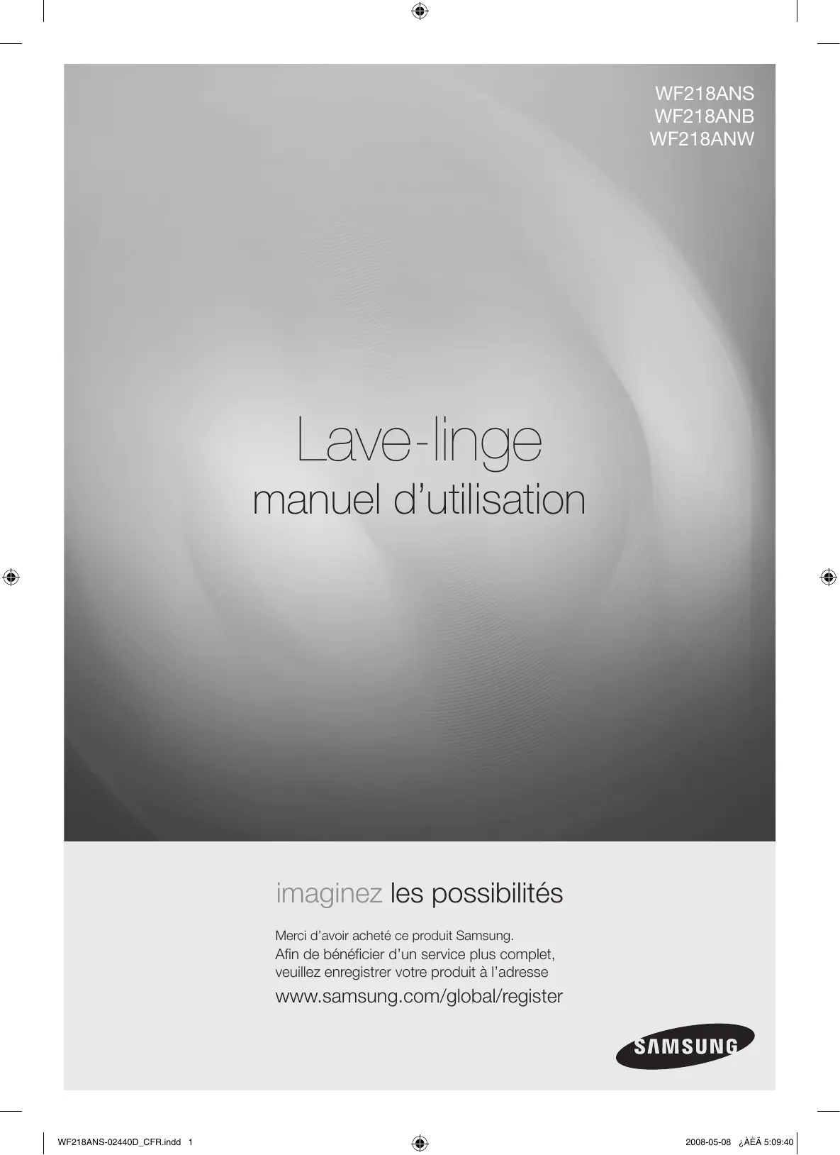 CANADA 1-800-SAMSUNG(726-7864) www.samsung.com/ca Code No. DC68-02440D_EN WF218ANS-02440D_EN.indd 28 2008-05-08 ¿ÀÈÄ 5:08:39 WF218ANS WF218ANB WF218ANW Lave-linge manuel d’utilisation imaginez les possibilités Merci d’avoir acheté ce produit Samsung. Afin de bénéficier d’un service plus complet, veuillez enregistrer votre produit à l’adresse www.samsung.com/global/register WF218ANS-02440D_CFR.indd 1 2008-05-08 ¿ÀÈÄ 5:09:40 caractéristiques de votre nouveau lave-linge