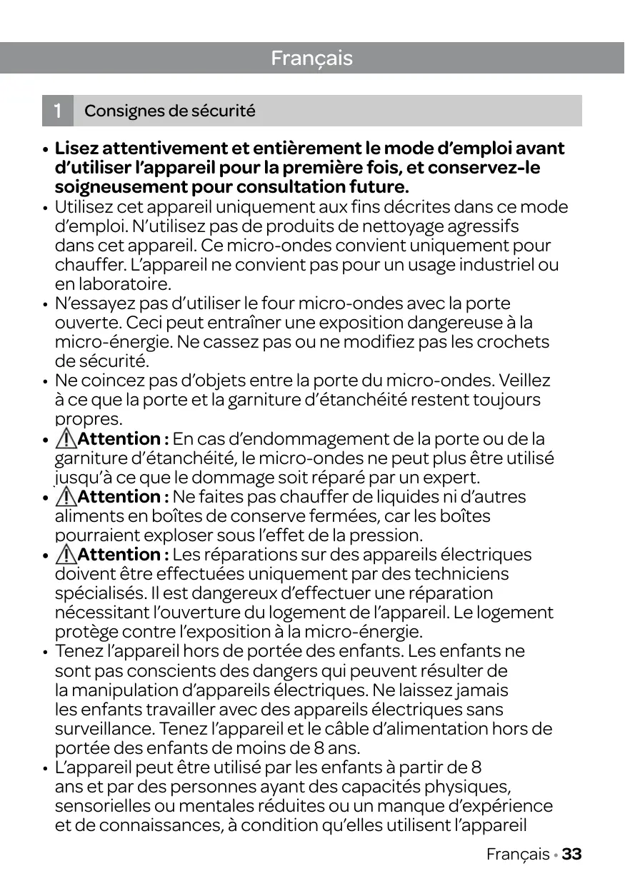 • Lisez attentivement et entièrement le mode d’emploi avant d’utiliser l’appareil pour la première fois, et conservez-le soigneusement pour consultation future. • Utilisez cet appareil uniquement aux fins décrites dans ce mode d’emploi. N’utilisez pas de produits de nettoyage agressifs dans cet appareil. Ce micro-ondes convient uniquement pour chauffer. L’appareil ne convient pas pour un usage industriel ou en laboratoire. • N’essayez pas d’utiliser le four micro-ondes avec la porte ouverte. Ceci peut entraîner une exposition dangereuse à la micro-énergie. Ne cassez pas ou ne modifiez pas les crochets de sécurité. • Ne coincez pas d’objets entre la porte du micro-ondes. Veillez à ce que la porte et la garniture d’étanchéité restent toujours propres. • Attention : En cas d’endommagement de la porte ou de la garniture d’étanchéité, le micro-ondes ne peut plus être utilisé jusqu’à ce que le dommage soit réparé par un expert. • Attention : Ne faites pas chauffer de liquides ni d’autres aliments en boîtes de conserve fermées, car les boîtes pourraient exploser sous l’effet de la pression. • Attention : Les réparations sur des appareils électriques doivent être effectuées uniquement par des techniciens spécialisés. Il est dangereux d’effectuer une réparation nécessitant l’ouverture du logement de l’appareil. Le logement protège contre l’exposition à la micro-énergie. • Tenez l’appareil hors de portée des enfants. Les enfants ne sont pas conscients des dangers qui peuvent résulter de la manipulation d’appareils électriques. Ne laissez jamais les enfants travailler avec des appareils électriques sans surveillance. Tenez l’appareil et le câble d’alimentation hors de portée des enfants de moins de 8 ans. • L’appareil peut être utilisé par les enfants à partir de 8 ans et par des personnes ayant des capacités physiques, sensorielles ou mentales réduites ou un manque d’expérience et de connaissances, à condition qu’elles utilisent l’appareil Français • 33