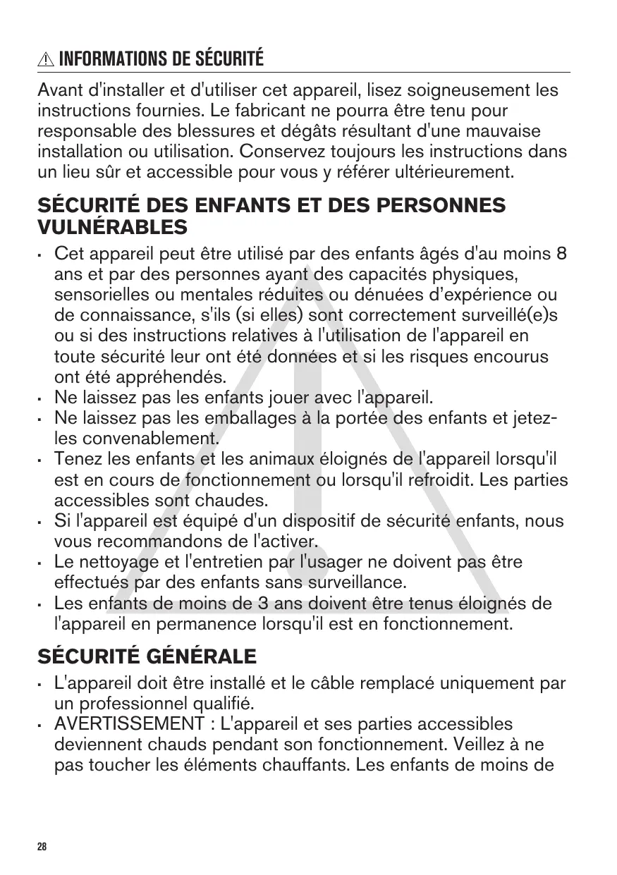 Tenez les enfants et les animaux éloignés de l'appareil lorsqu'il est en cours de fonctionnement ou lorsqu'il refroidit. Les parties accessibles sont chaudes. Si l'appareil est équipé d'un dispositif de sécurité enfants, nous vous recommandons de l'activer. Le nettoyage et l'entretien par l'usager ne doivent pas être effectués par des enfants sans surveillance. Les enfants de moins de 3 ans doivent être tenus éloignés de l'appareil en permanence lorsqu'il est en fonctionnement.