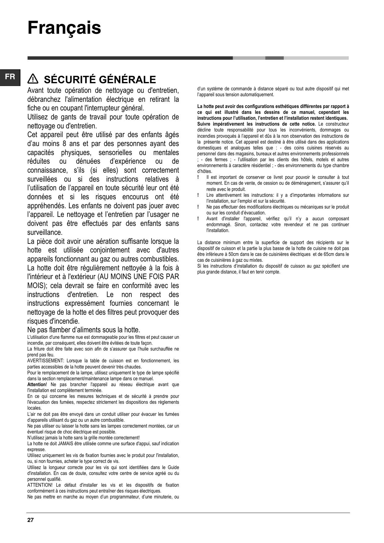 SÉCURITÉ GÉNÉRALE Avant toute opération de nettoyage ou d'entretien, débranchez l'alimentation électrique en retirant la fiche ou en coupant l'interrupteur général. Utilisez de gants de travail pour toute opération de nettoyage ou d'entretien. Cet appareil peut être utilisé par des enfants âgés d’au moins 8 ans et par des personnes ayant des capacités physiques, sensorielles ou mentales réduites ou dénuées d’expérience ou de connaissance, s’ils (si elles) sont correctement surveillées ou si des instructions relatives à l’utilisation de l’appareil en toute sécurité leur ont été données et si les risques encourus ont été appréhendés. Les enfants ne doivent pas jouer avec l’appareil. Le nettoyage et l’entretien par l’usager ne doivent pas être effectués par des enfants sans surveillance. La pièce doit avoir une aération suffisante lorsque la hotte est utilisée conjointement avec d'autres appareils fonctionnant au gaz ou autres combustibles. La hotte doit être régulièrement nettoyée à la fois à l'intérieur et à l'extérieur (AU MOINS UNE FOIS PAR MOIS); cela devrait se faire en conformité avec les instructions d'entretien. Le non respect des instructions expressément fournies concernant le nettoyage de la hotte et des filtres peut provoquer des risques d'incendie. Ne pas flamber d’aliments sous la hotte.