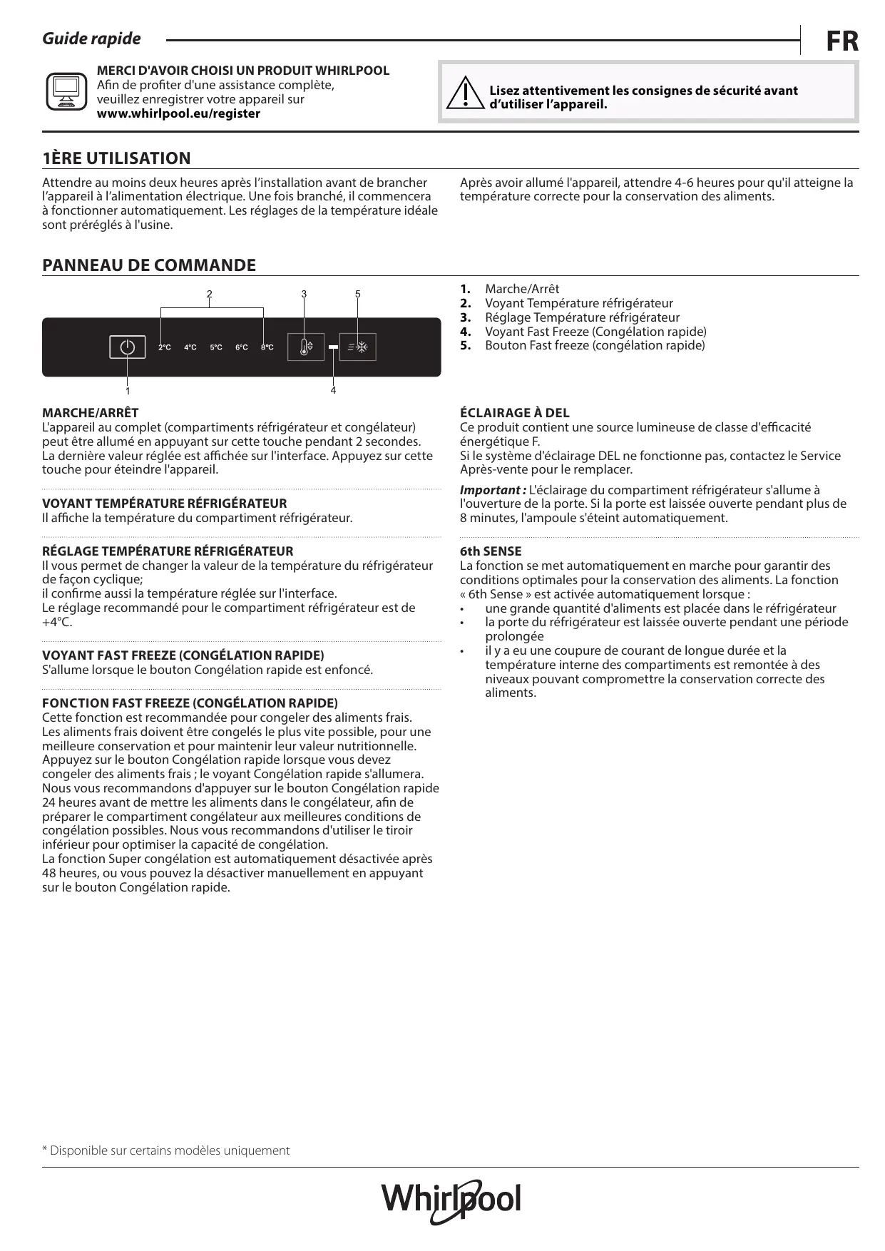 Afin de profiter d'une assistance complète, veuillez enregistrer votre appareil sur www.whirlpool.eu/register Lisez attentivement les consignes de sécurité avant d’utiliser l’appareil. 1ÈRE UTILISATION Attendre au moins deux heures après l’installation avant de brancher l’appareil à l’alimentation électrique. Une fois branché, il commencera à fonctionner automatiquement. Les réglages de la température idéale sont préréglés à l'usine. Après avoir allumé l'appareil, attendre 4-6 heures pour qu'il atteigne la température correcte pour la conservation des aliments.