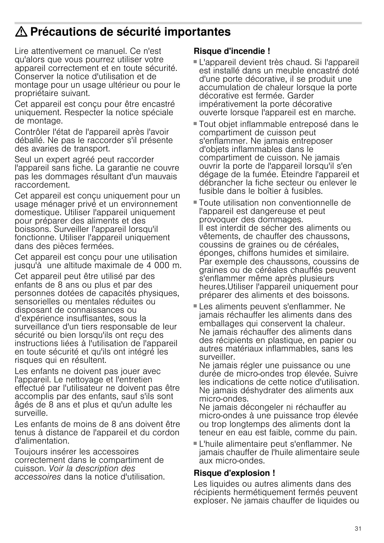 Risque d'incendie ! ■ L'appareil devient très chaud. Si l'appareil est installé dans un meuble encastré doté d'une porte décorative, il se produit une accumulation de chaleur lorsque la porte décorative est fermée. Garder impérativement la porte décorative ouverte lorsque l'appareil est en marche. ■ Tout objet inflammable entreposé dans le compartiment de cuisson peut s'enflammer. Ne jamais entreposer d'objets inflammables dans le compartiment de cuisson. Ne jamais ouvrir la porte de l'appareil lorsqu'il s'en dégage de la fumée. Éteindre l'appareil et débrancher la fiche secteur ou enlever le fusible dans le boîtier à fusibles. ■ Toute utilisation non conventionnelle de l'appareil est dangereuse et peut provoquer des dommages. Il est interdit de sécher des aliments ou vêtements, de chauffer des chaussons, coussins de graines ou de céréales, éponges, chiffons humides et similaire. Par exemple des chaussons, coussins de graines ou de céréales chauffés peuvent s'enflammer même après plusieurs heures.Utiliser l'appareil uniquement pour préparer des aliments et des boissons. ■ Les aliments peuvent s'enflammer. Ne jamais réchauffer les aliments dans des emballages qui conservent la chaleur. Ne jamais réchauffer des aliments dans des récipients en plastique, en papier ou autres matériaux inflammables, sans les surveiller. Ne jamais régler une puissance ou une durée de micro-ondes trop élevée. Suivre les indications de cette notice d'utilisation. Ne jamais déshydrater des aliments aux micro-ondes. Ne jamais décongeler ni réchauffer au micro-ondes à une puissance trop élevée ou trop longtemps des aliments dont la teneur en eau est faible, comme du pain. ■ L'huile alimentaire peut s'enflammer. Ne jamais chauffer de l'huile alimentaire seule aux micro-ondes. Risque d'explosion ! Les liquides ou autres aliments dans des récipients hermétiquement fermés peuvent exploser. Ne jamais chauffer de liquides ou Risque d'incendie !