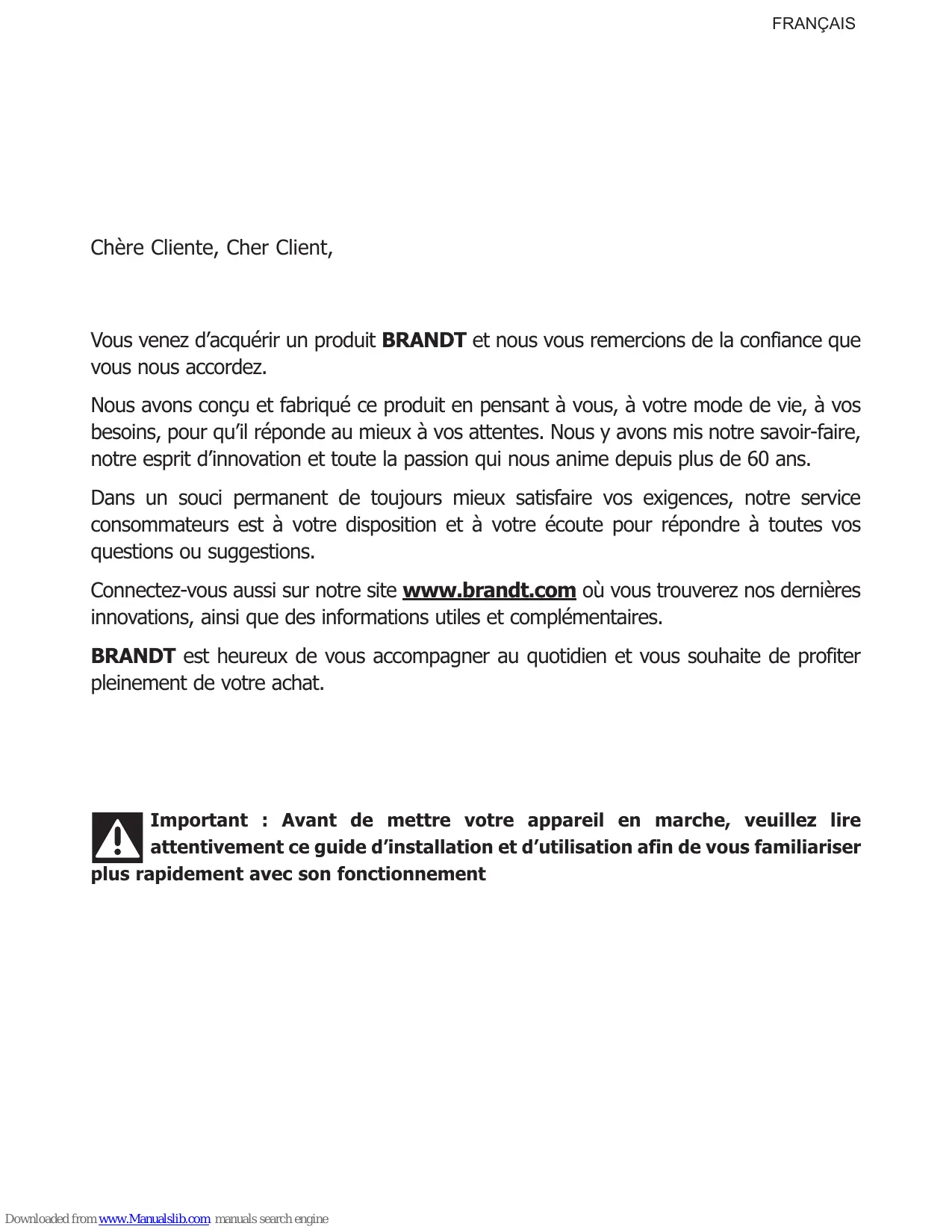 Dans un souci permanent de toujours mieux satisfaire vos exigences, notre service consommateurs est à votre disposition et à votre écoute pour répondre à toutes vos questions ou suggestions. Connectez-vous aussi sur notre site www.brandt.com où vous trouverez nos dernières innovations, ainsi que des informations utiles et complémentaires. BRANDT est heureux de vous accompagner au quotidien et vous souhaite de profiter pleinement de votre achat.