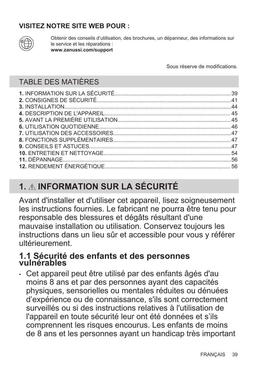 Obtenir des conseils d’utilisation, des brochures, un dépanneur, des informations sur le service et les réparations : www.zanussi.com/support