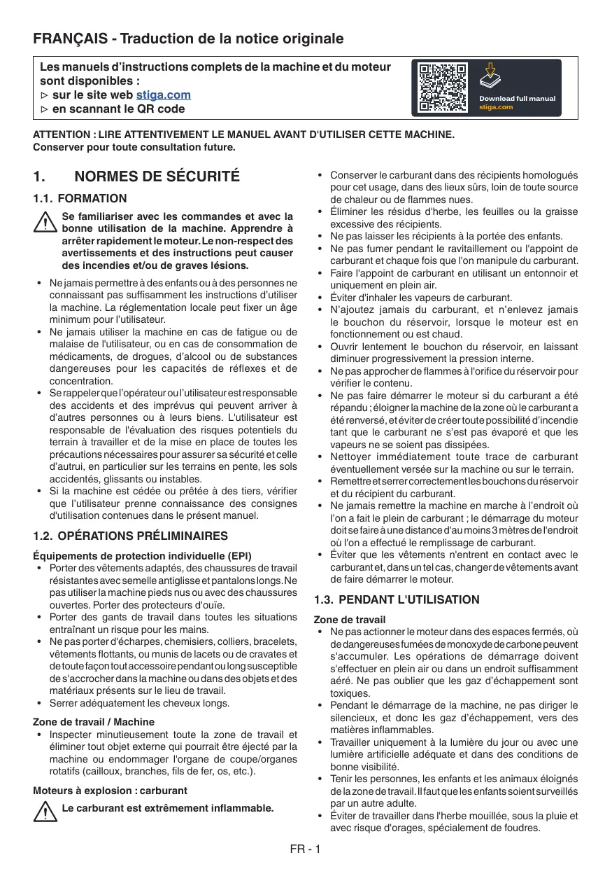 FRANÇAIS - Traduction de la notice originale Les manuels d’instructions complets de la machine et du moteur sont disponibles : ▷ sur le site web stiga.com ▷ en scannant le QR code ATTENTION : LIRE ATTENTIVEMENT LE MANUEL AVANT D'UTILISER CETTE MACHINE. Conserver pour toute consultation future.