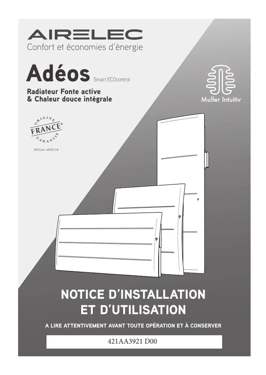 page 20 page 22 page page page 24 page 26 page 26 page 27 page 28 Qualité certifiée Nos appareils sont conçus, développés et fabriqués en France dans nos usines. AVANT PROPOS : - Vous venez d’acquérir ce Radiateur communicant à chaleur douce intégrale avec Fonte active Adéos SMART ECOcontrol d’Airélec et nous vous remercions de ce choix, témoignant ainsi de votre confiance. - Cet appareil a été étudié, conçu et réalisé avec soin pour vous donner entière satisfaction. - Il est important de bien lire cette notice en entier avant l’installation et la mise en route de votre appareil. - Il est recommandé de conserver cette notice, même après installation de votre appareil.